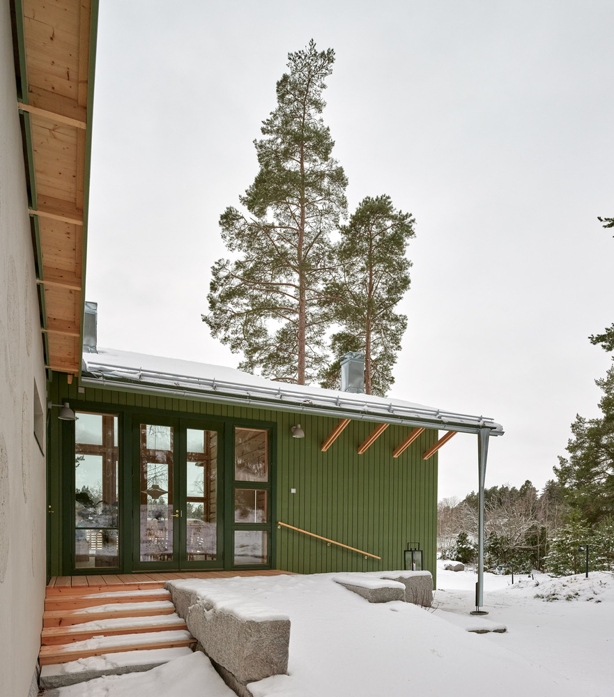 Huvila House's spatial design is a masterclass in creating harmony between the interior and the natural world. The layout includes a wooden gabled roof structure, with a high-glazed orangery space and a veranda offering intimate connections with the surrounding nature. The positioning of windows and doors is meticulously planned to frame views of the forest and fields, controlling light and creating individualized, picturesque scenes from each room.