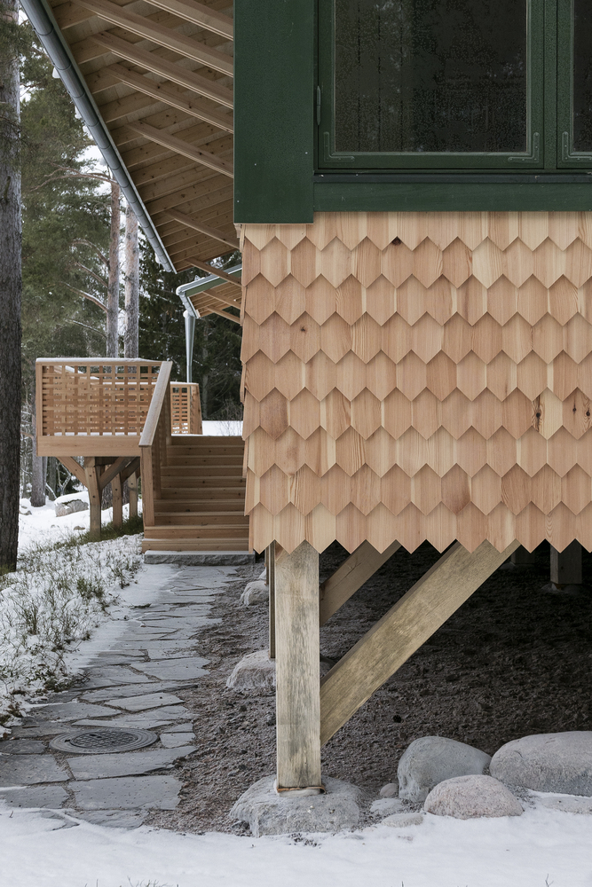 The house's construction is a testament to skilled craftsmanship, with particular attention to wooden railings, shingle cladding walls, and natural stone work. Ceramics and contemporary art play a significant role in the interior design, with site-specific pieces by Kristina Riska enhancing the sensory experience of the space. The attention to detail in the handmade elements of Huvila House underscores the project's commitment to quality and personalization.