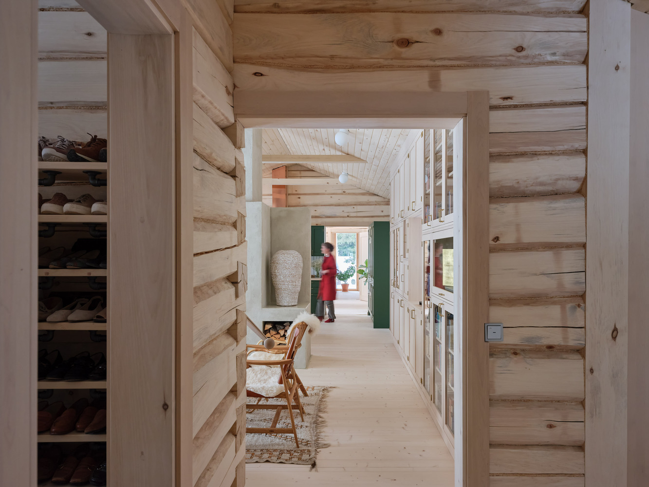 The architectural team embarked on a meticulous journey to identify materials that would meet the client's unique needs. The solution was found in monolithic materials known for their ability to regulate humidity and purify indoor air, thus fostering an atmosphere of well-being. The house divides spatially into a wooden section and a masonry section, utilizing massive, insulating burnt clay blocks and aspen logs, respectively. This choice of materials not only addresses the client's sensitivities but also minimizes the house's ecological footprint.
