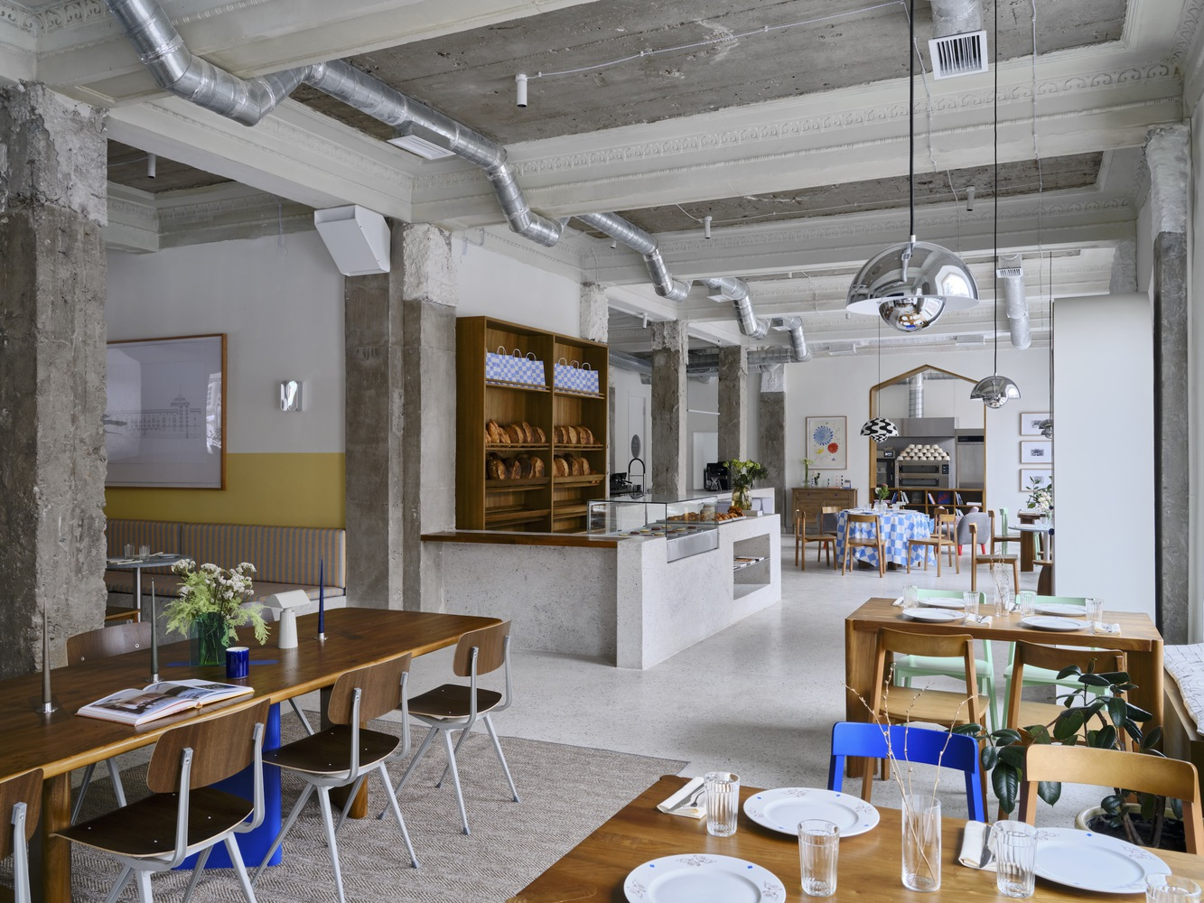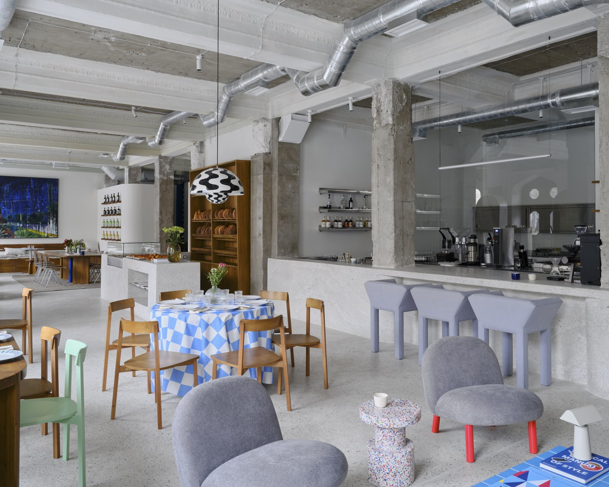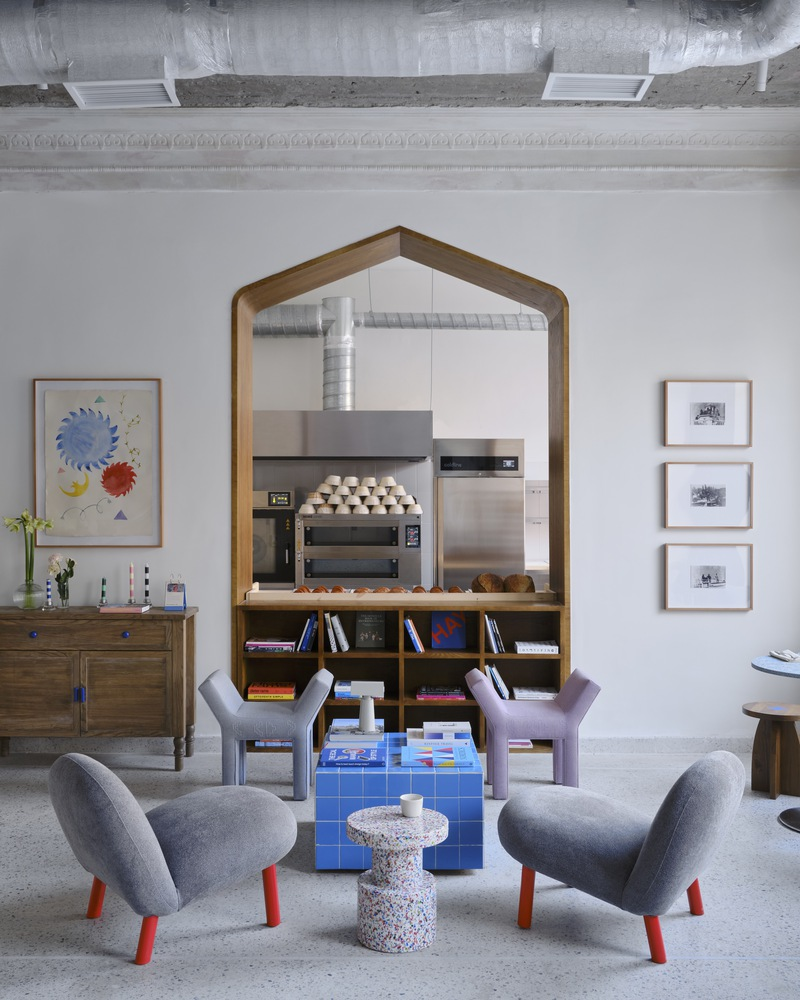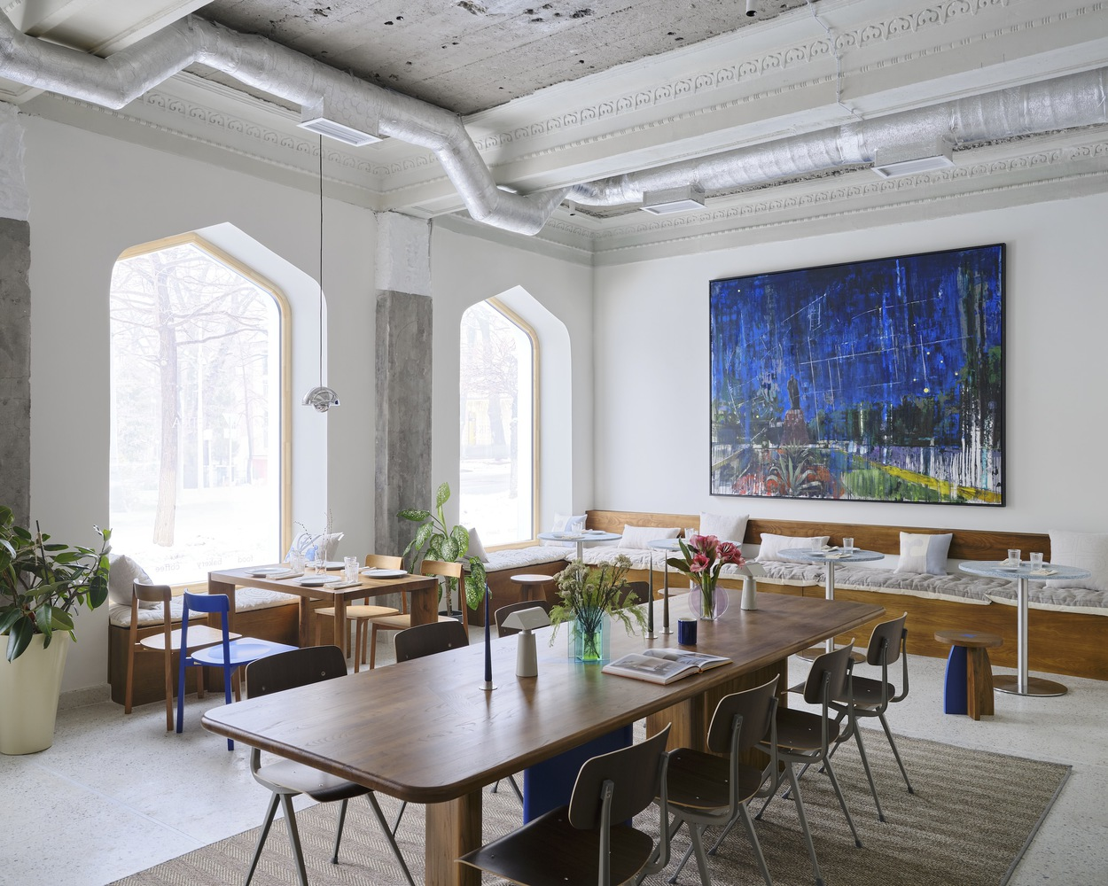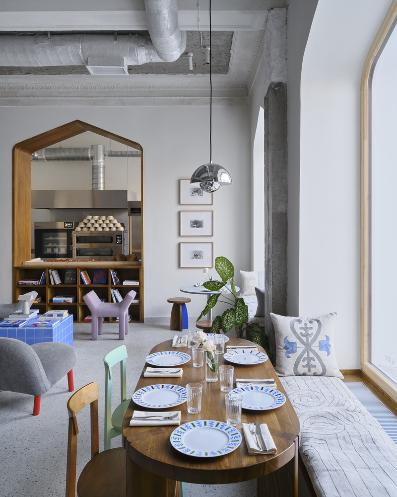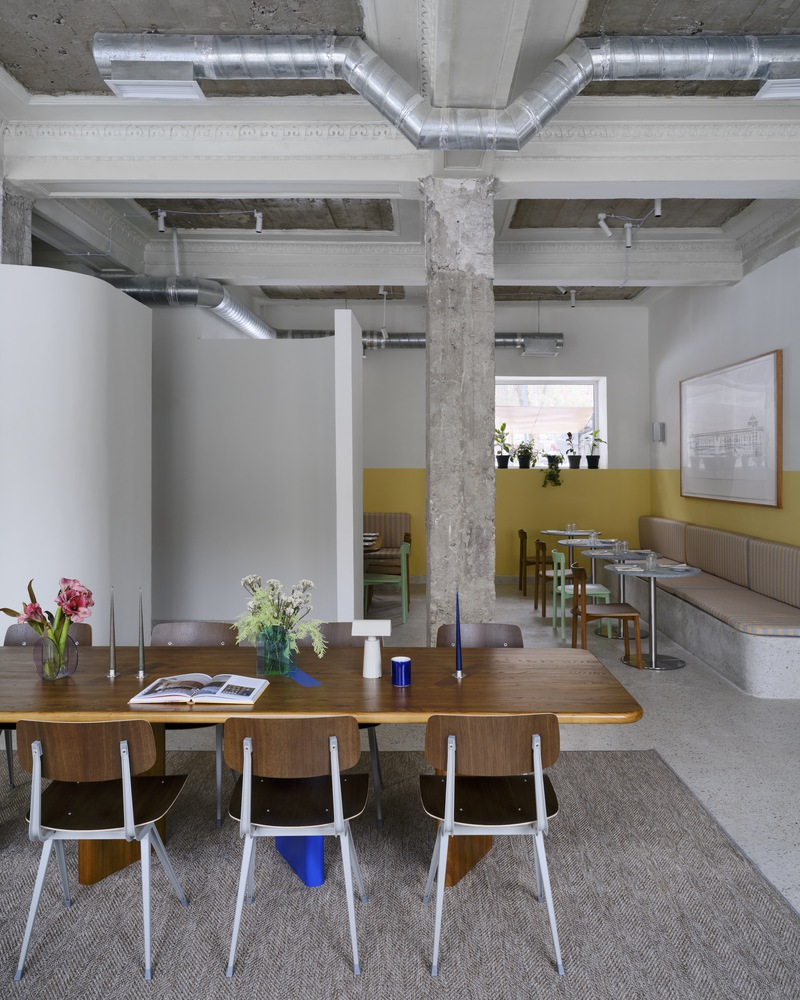 The café’s design subtly nods to its Soviet-era heritage, particularly in the choice of colors and materials. The use of yellow-painted dado walls and locally sourced wood for furniture adds warmth and charm, reminiscent of Soviet establishments, reinterpreted for contemporary tastes.