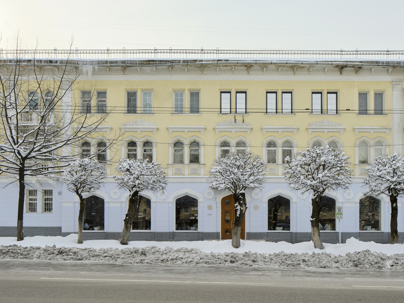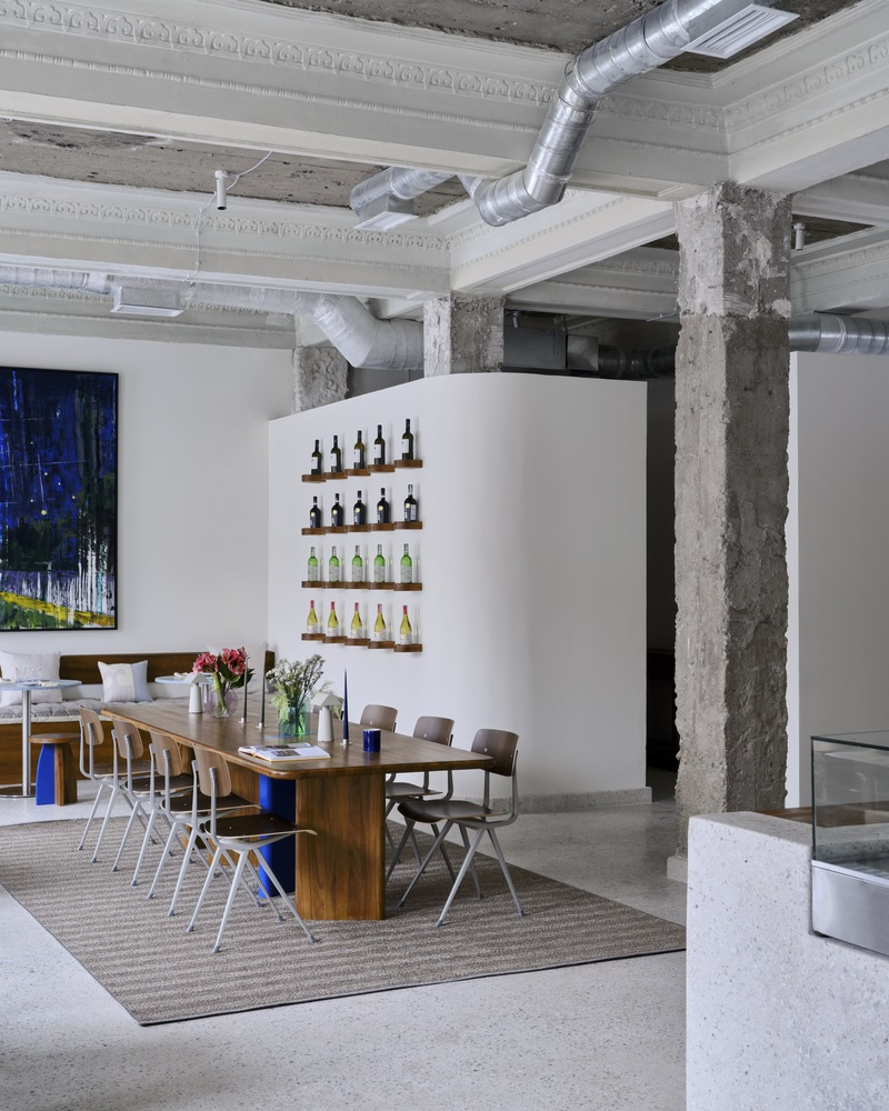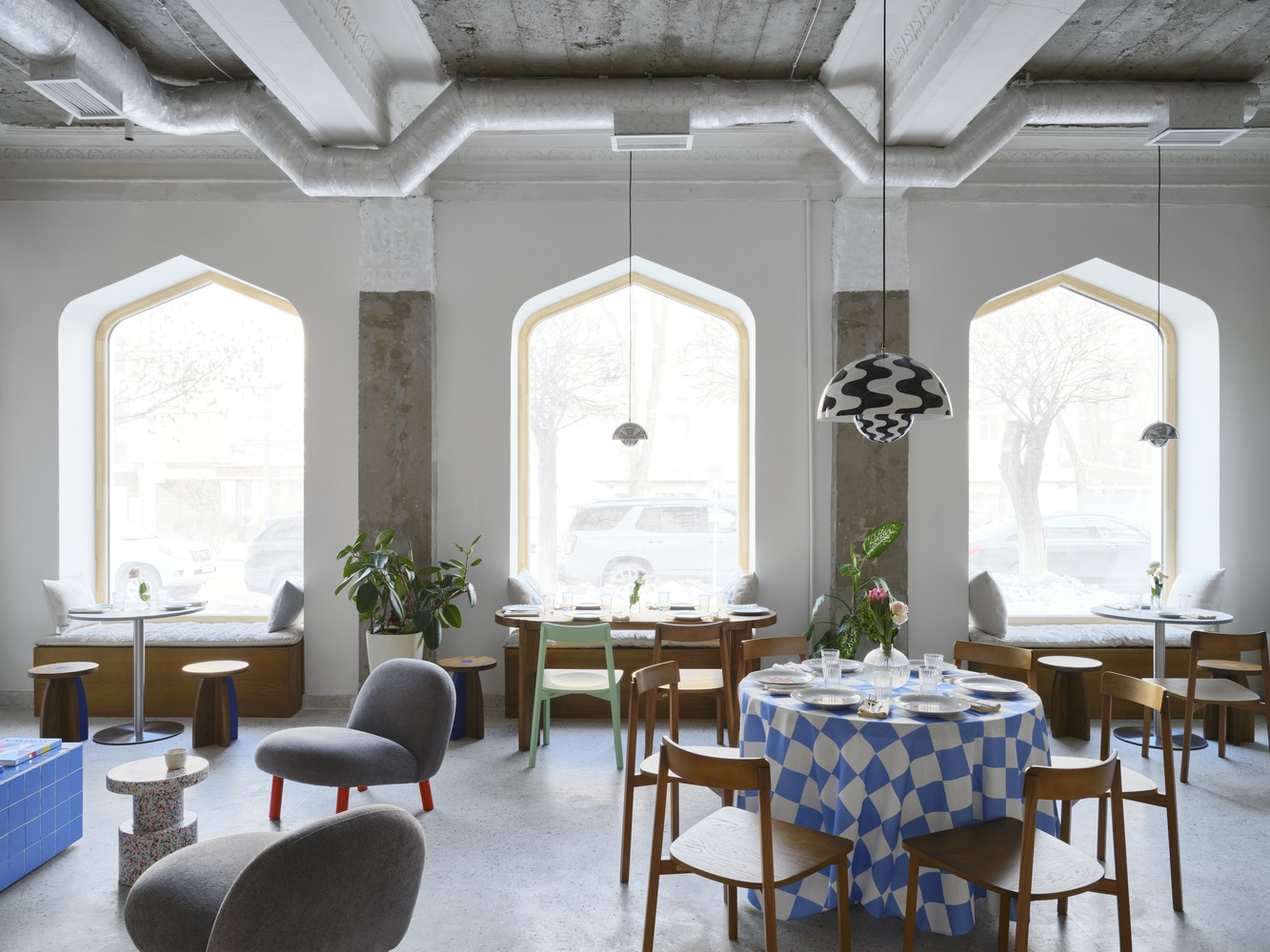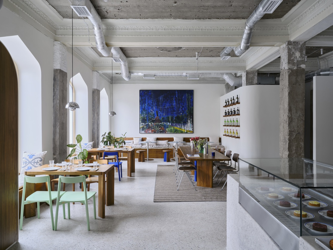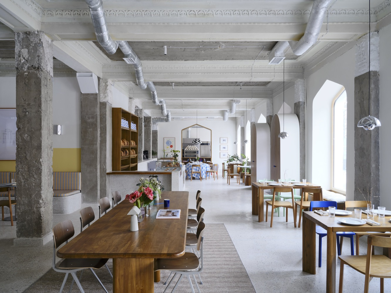 The café’s design subtly nods to its Soviet-era heritage, particularly in the choice of colors and materials. The use of yellow-painted dado walls and locally sourced wood for furniture adds warmth and charm, reminiscent of Soviet establishments, reinterpreted for contemporary tastes.