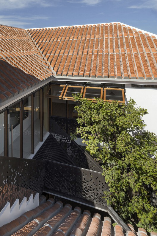 The first floor takes a bold departure from the ground floor by rotating 180 degrees. This shift creates a closed layout around an inner courtyard, where the landscape and captivating views take center stage. Harmonizing with the indigenous Hoi An tile roof system, this floor embraces local climate adaptability. The juxtaposition of contemporary exterior and intimate interior atmospheres adds an element of surprise to the architectural narrative.