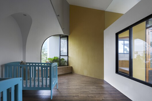 The ground floor of the ROTATING house is a dedicated haven for the children's "learning by playing" activities. With a large playground formed by the empty floor between two gardens, the design ensures a harmonious blend of recreation and education. The working space and kitchen for the parents are strategically positioned as a "supported zone," allowing constant supervision of the children's activities.