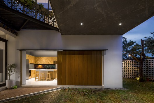 The pivotal concept of rotating the entire building by 45 degrees serves multiple purposes. Firstly, it disrupts the parallelism between the structure and the site boundary, creating an oblique azimuth that enhances the depth of the building. This unexpected direction, combined with interwoven spaces of solidity (inside) and void (outside), not only defies conventional design but also addresses feng shui principles, diffusing the impact of an internal road on the rear facade. The rotation additionally facilitates an active ventilation path throughout the entire residence.