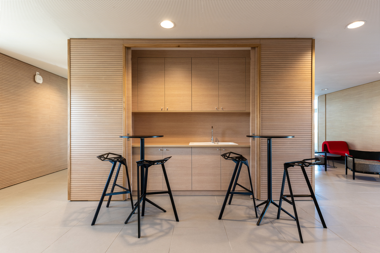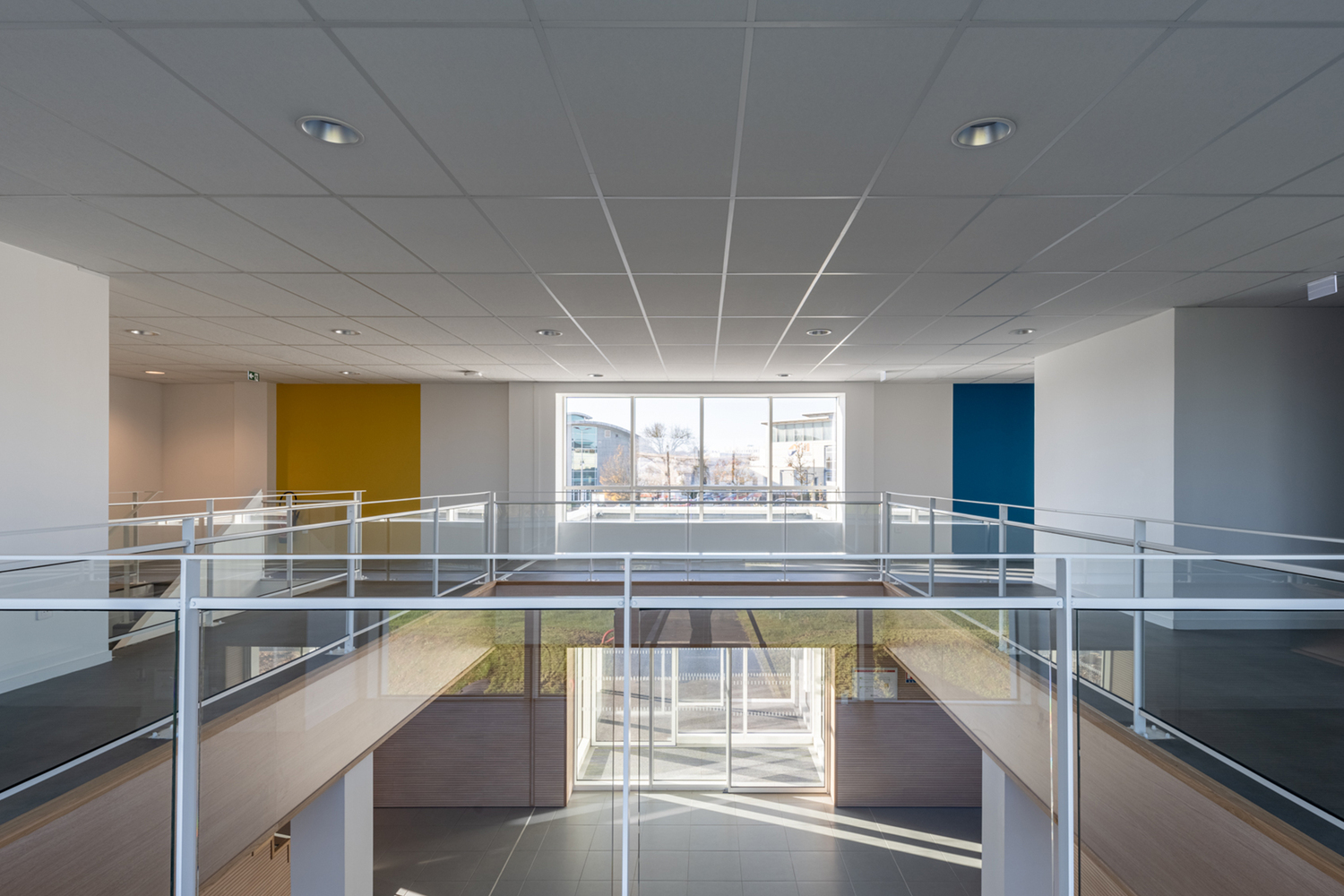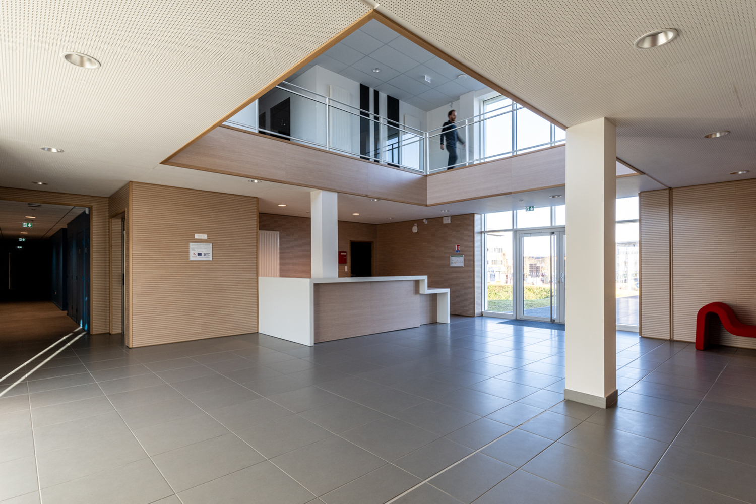 Inside, the facility is designed around a central atrium, which serves as a communal meeting space for researchers and visitors. This atrium is not just a functional space for interaction but also contributes to the facility’s overall acoustic management, reflecting the core focus of the campus.