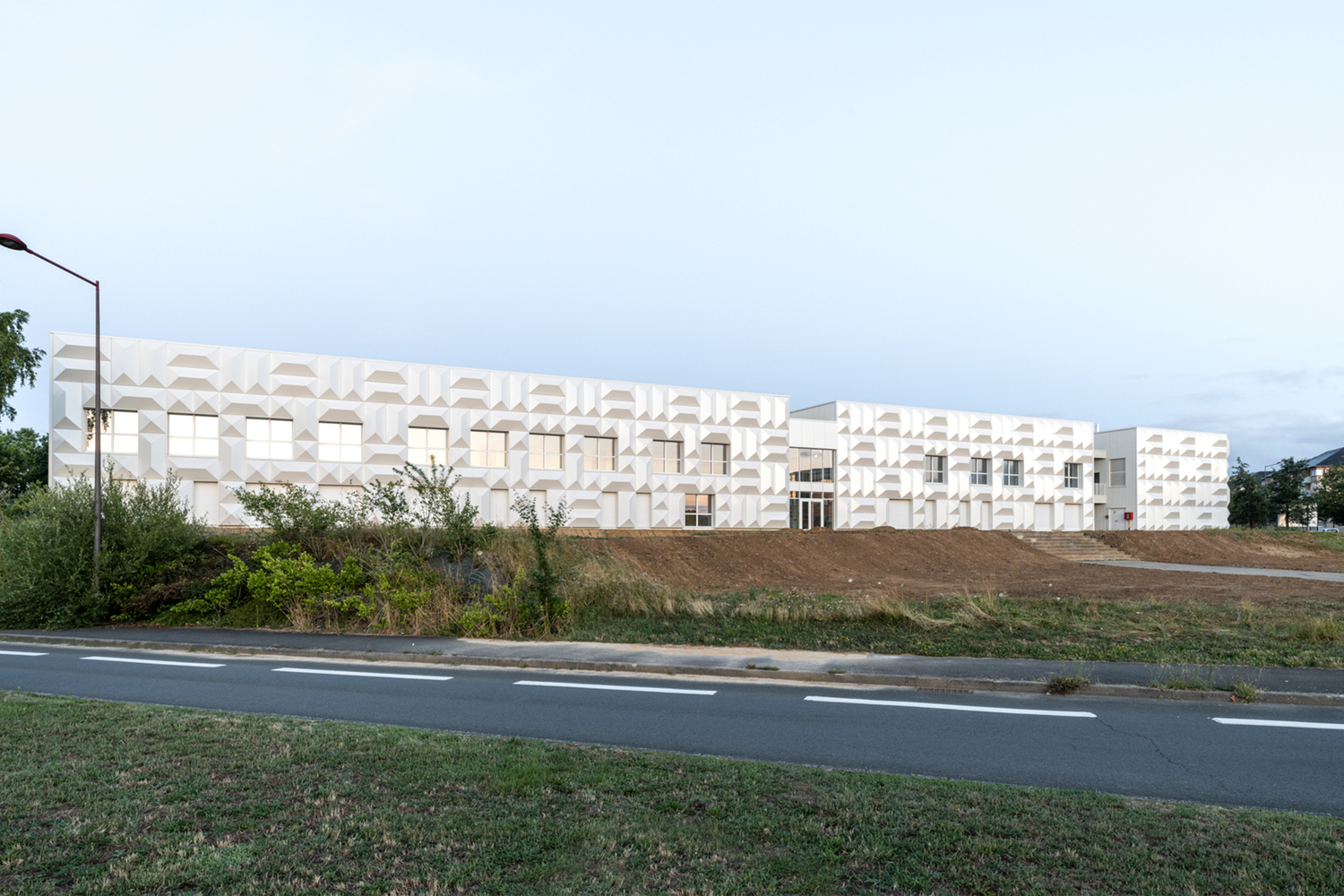 One of the most striking features of the Technocampus Acoustique is its innovative façade design. Utilizing Alucobond, a material chosen for its adaptability and durability, the architects crafted a façade that mimics an anechoic pattern. This design not only enhances the building's aesthetic but also plays a functional role in its acoustic properties. The use of white Alucobond blocks creates a dynamic interplay of light and shadow, which emphasizes the relief of the façade while integrating harmoniously with the surrounding environment.