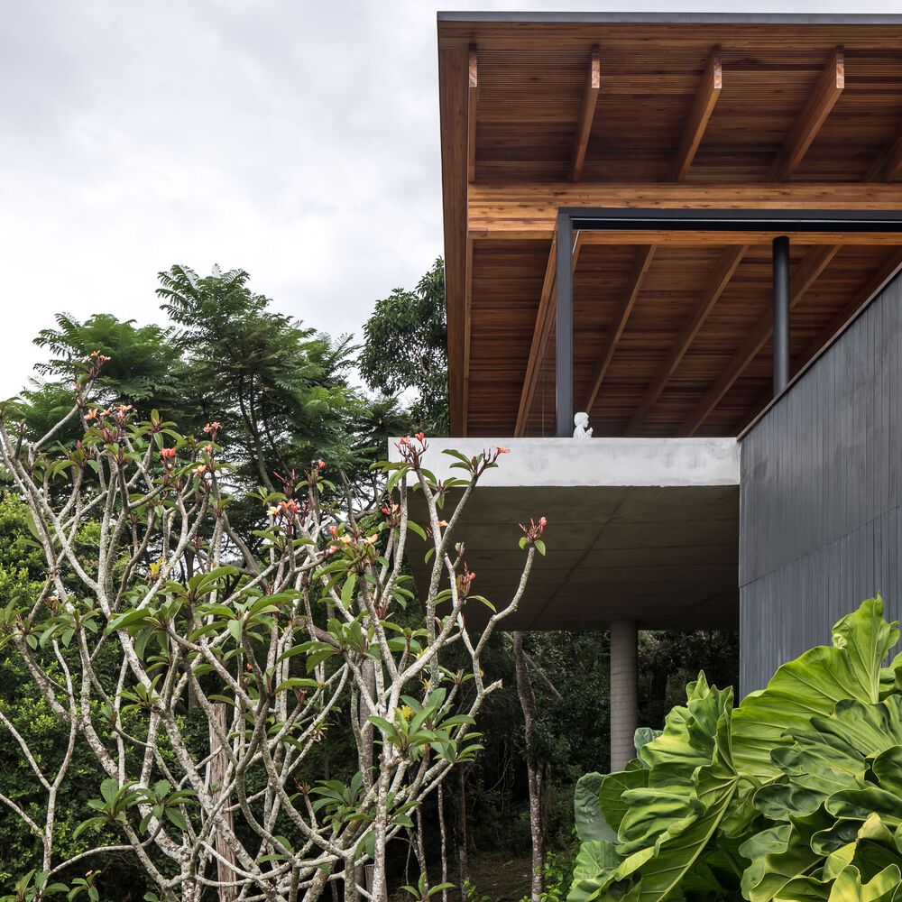 The construction of FB House showcases a blend of exposed reinforced concrete and engineered eucalyptus wood (MLC), creating a modular and aesthetic structural expression. The use of metal columns and aluminum frames supports the wooden structure, ensuring both sturdiness and visual lightness. The floors are made of techno-cement, which complements the house's modern aesthetic while providing durability.