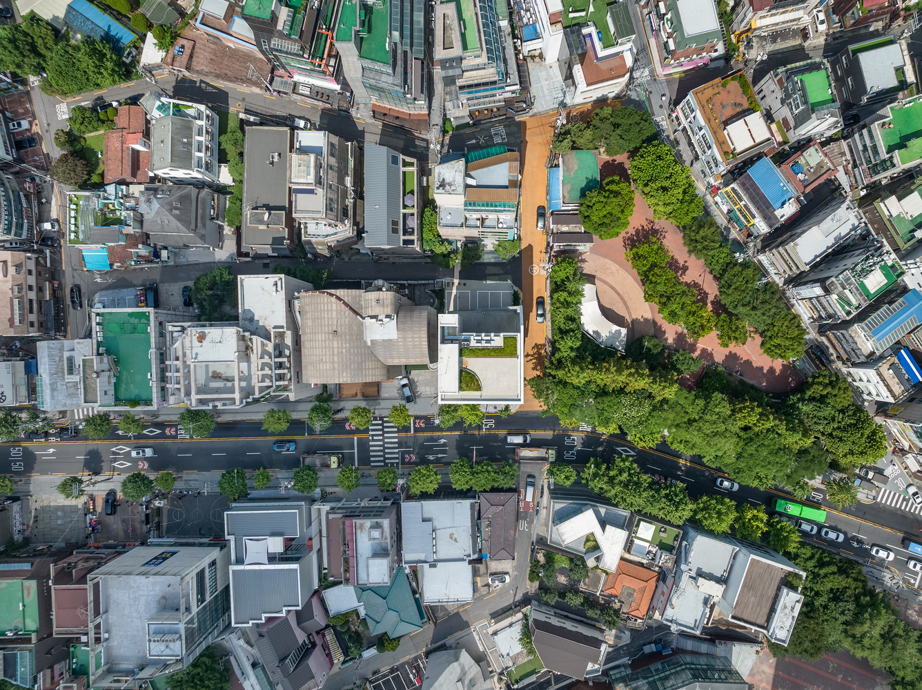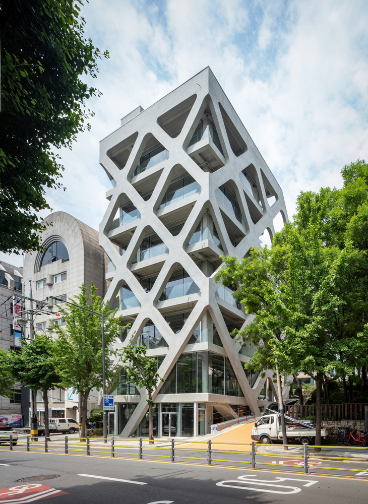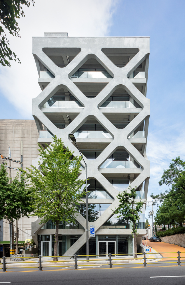 Pedestrians walking past the facility discover a building that offers a moment of respite. The folded concrete surfaces break up the otherwise monotonous urban backdrop, providing a dynamic yet peaceful transition between the hustle of Hongdae and the calm of the park. The building is an oasis of calm amidst the constant flow of activity in the area.