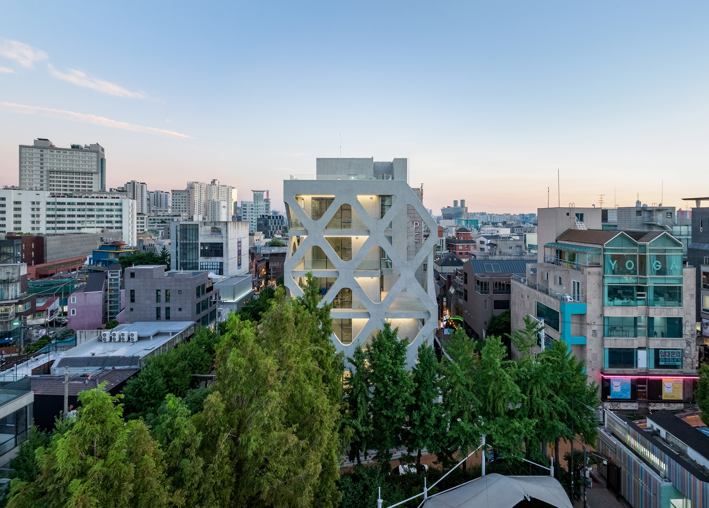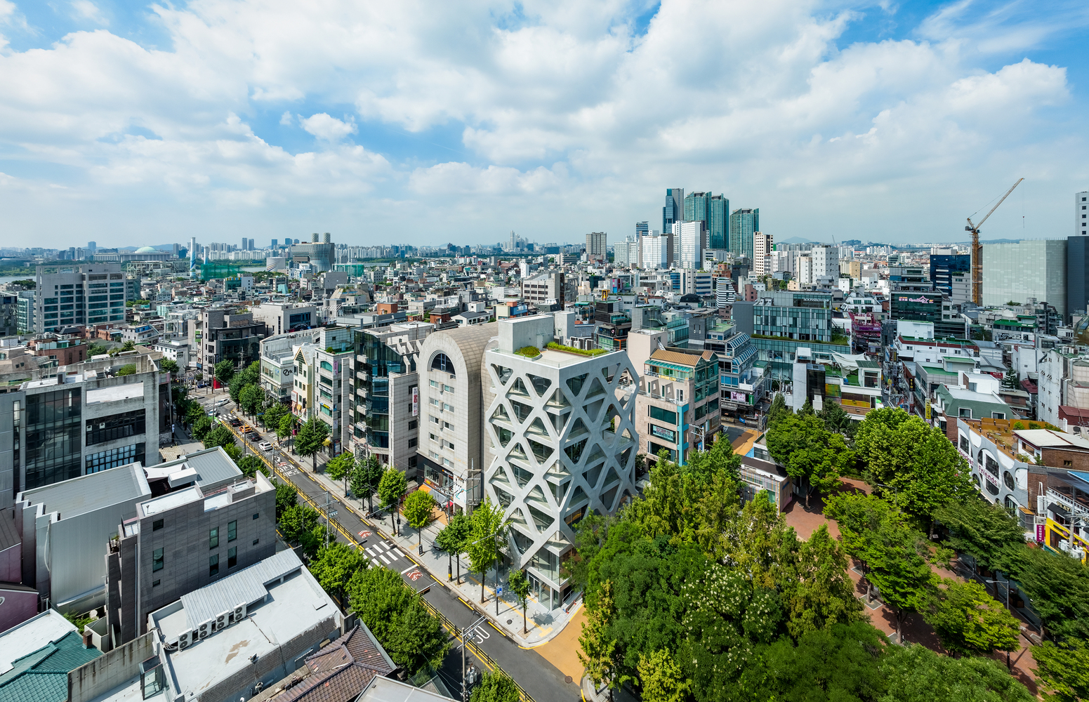 Explore the innovative architectural design of the "Folded Ground" neighborhood facility, seamlessly blending with Hongdae's vibrant urban context.