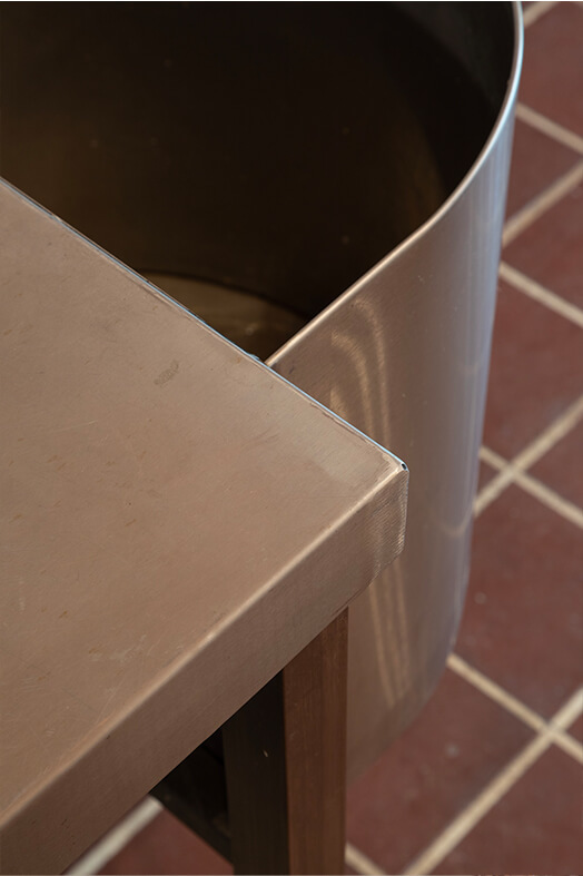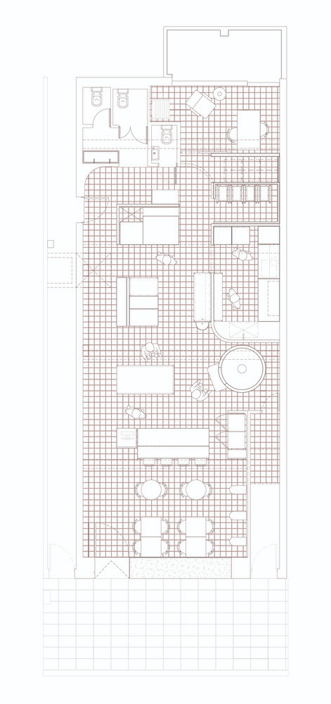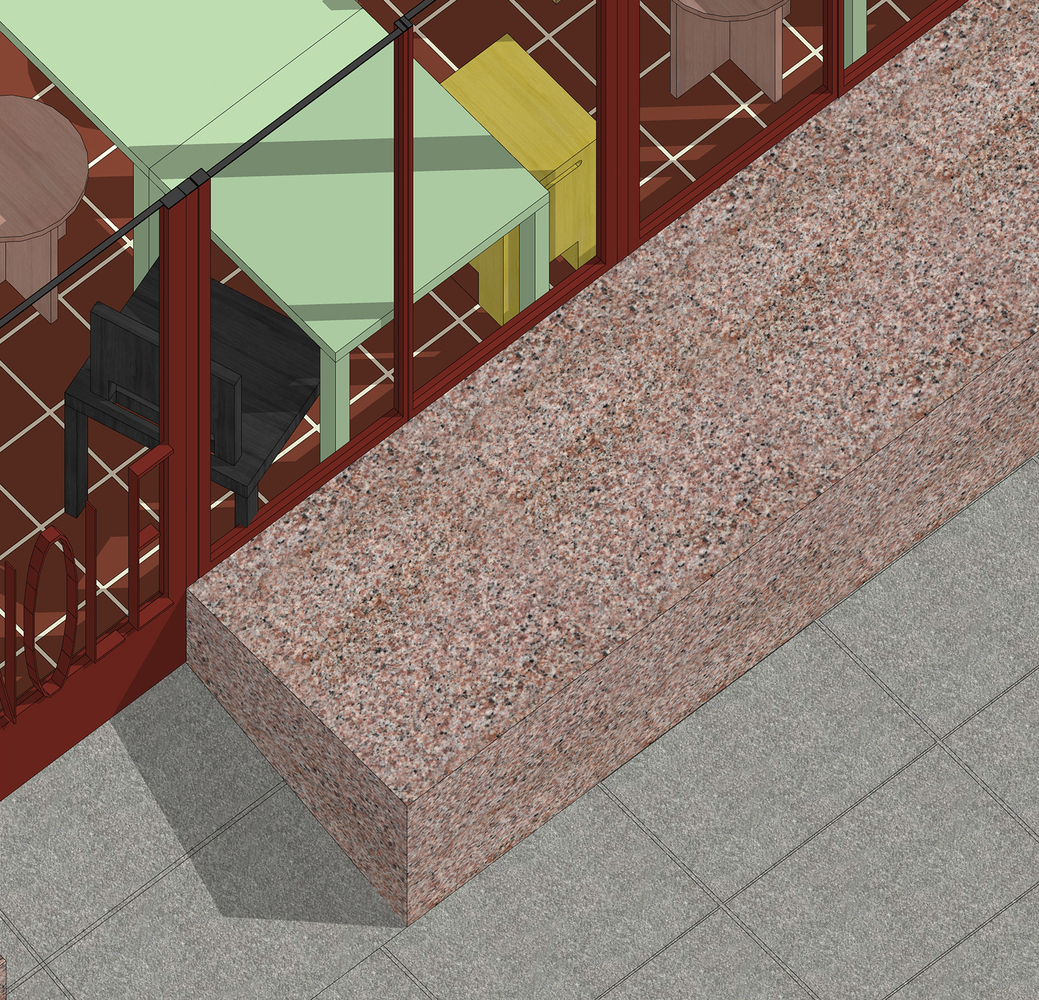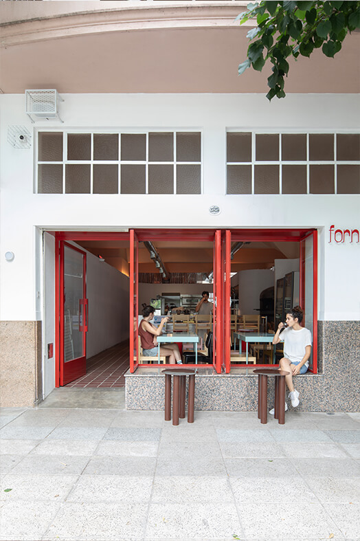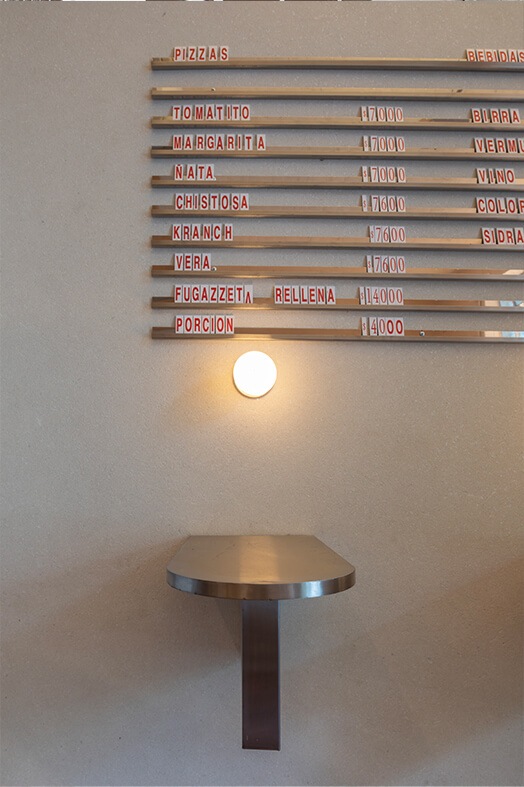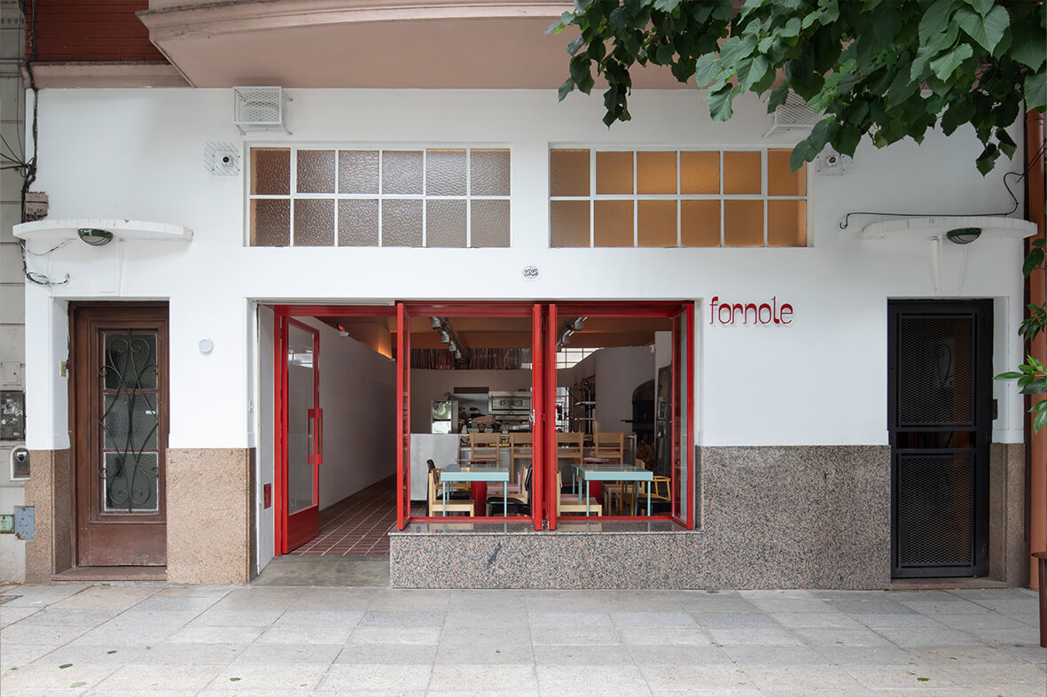 The restaurant's storefront, constructed from metal carpentry, is designed to open completely, blurring the boundaries between indoor and outdoor spaces. A concrete bench adorned with Rosa de Salto granite extends the material narrative of the facade, nodding to the classic Buenos Aires architectural heritage.