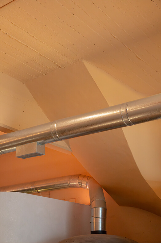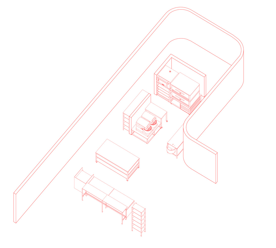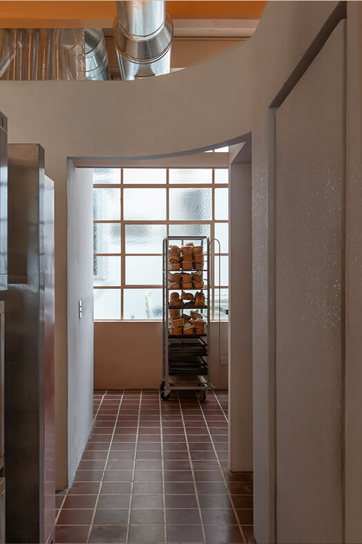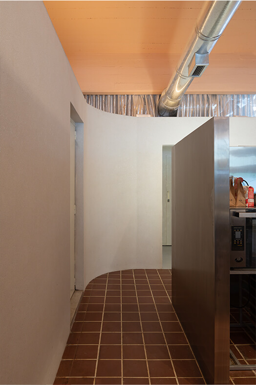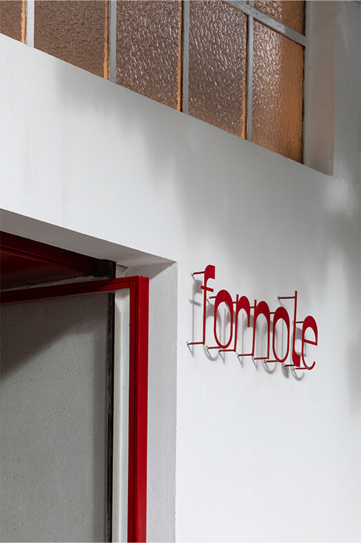 Fornole Pizza's interior is a grand open kitchen dedicated to the art of pizza and bread-making. A distinctive ribbon wall contours the space, serving dual purposes: it scales down the vastness of the original concrete enclosure and discreetly integrates essential service areas, including the kitchen, a refrigerated chamber, a flour warehouse, and restrooms.