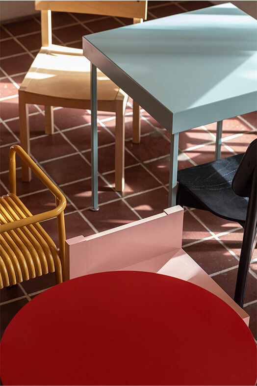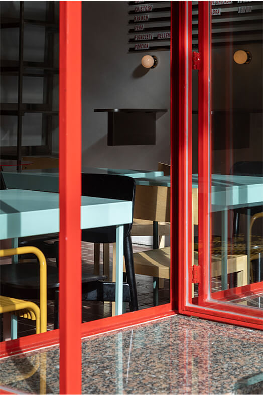 The furniture selection within Fornole Pizza is envisioned as a collection of colorful objects, each bearing its unique hue. A vibrant palette of red, pink, green, brown, yellow, black, and wood stands in bold contrast against the restaurant's original checkered flooring, adding layers of warmth and whimsy to the dining experience.