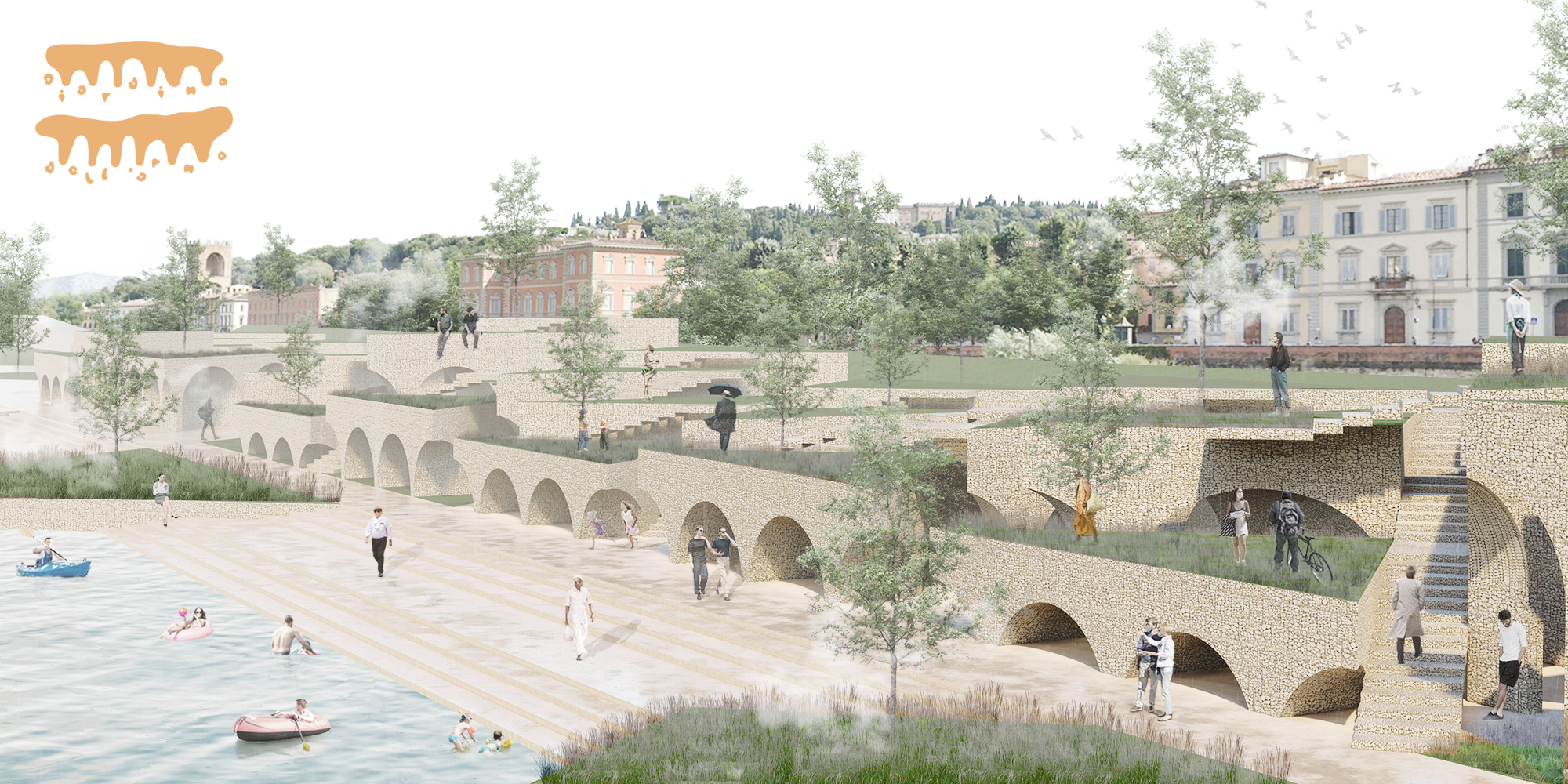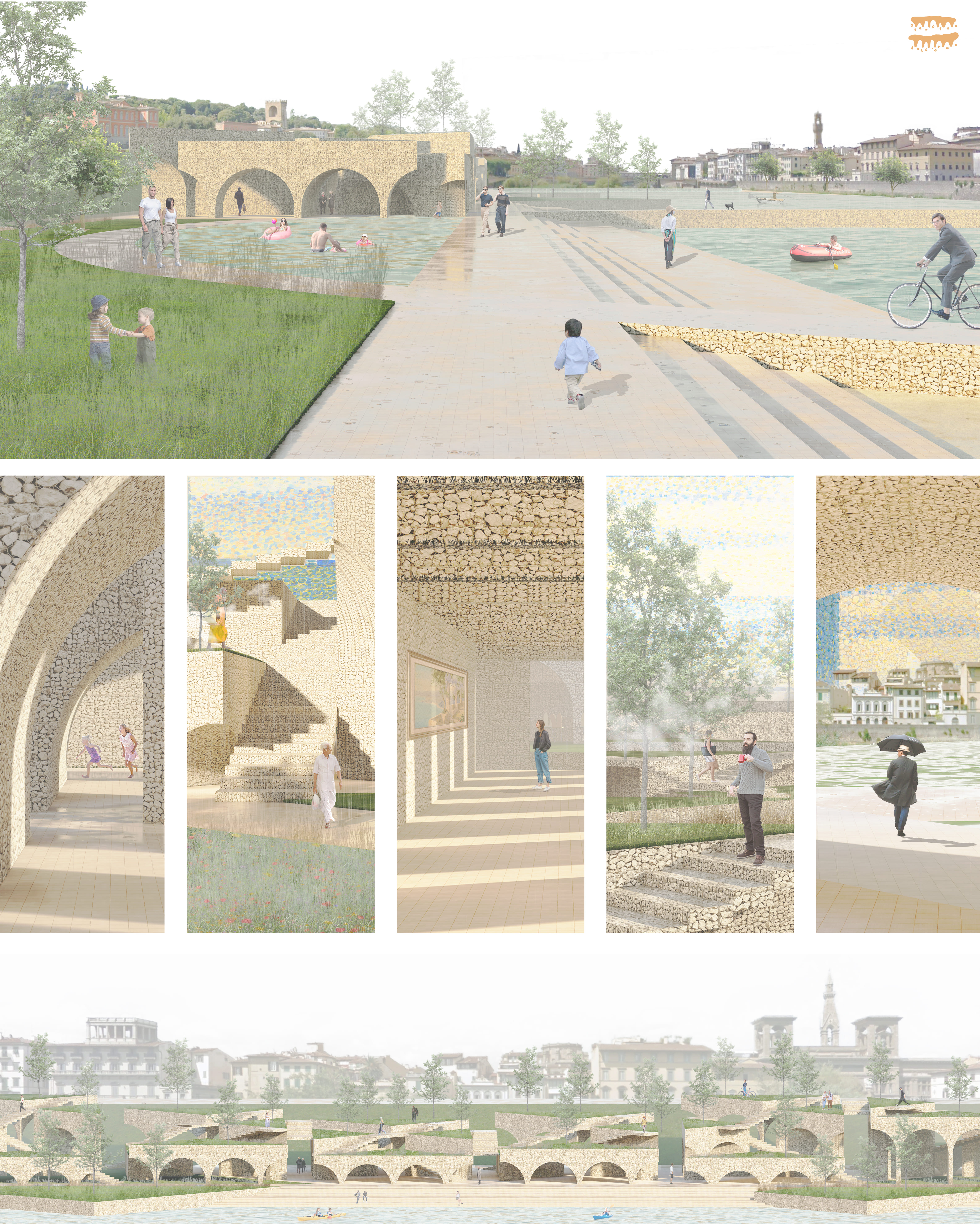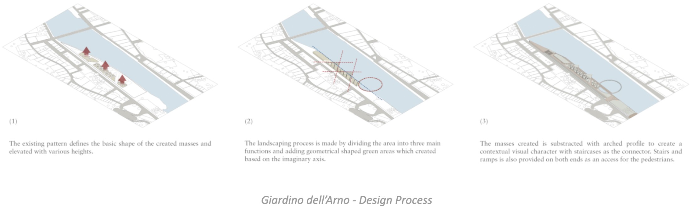 Initially, the new Giardino dell'Arno connects the characteristics of Terzo Giardino and the history of the 1966 Arno floods through flood-resistant design. Giardino dell'Arno aims to shift the public’s paradigm in the incident that happened in the past with a positive outlook. Giardino dell'Arno is a tribute to the Arno River, the river that empowers the city, and the one that can wipe it all away.