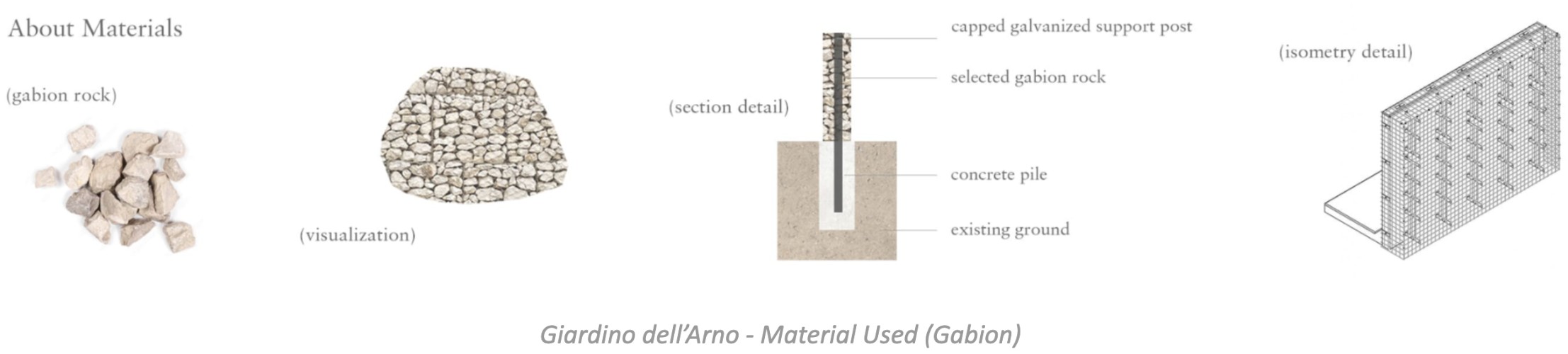 Gabion was chosen to be the main material of this project. Not only the shade of stone resembles the one that are used on buildings in the surroundings, but the gaps between the rock formation helps to break down the wave in an event of a rapid displacement of the water. Gabion also allows for soil to be placed on top, which then can be developed into a green grass roof.