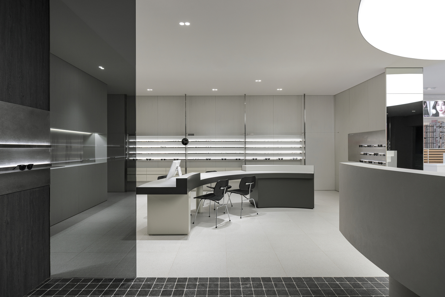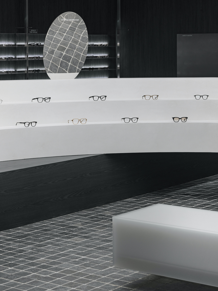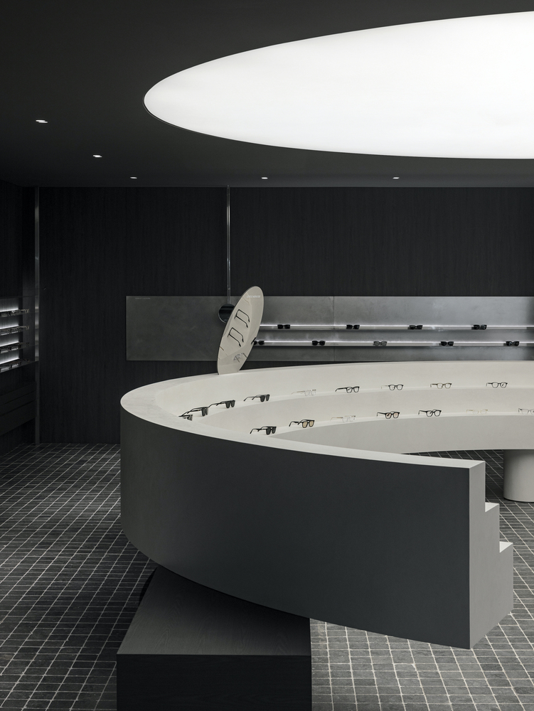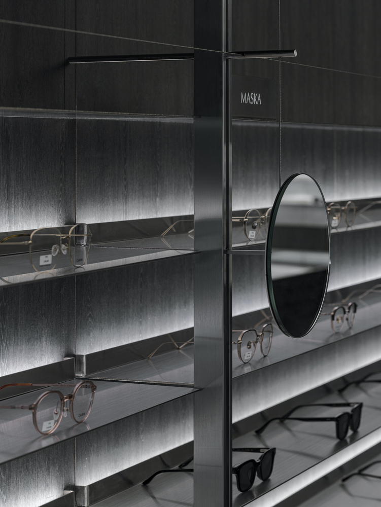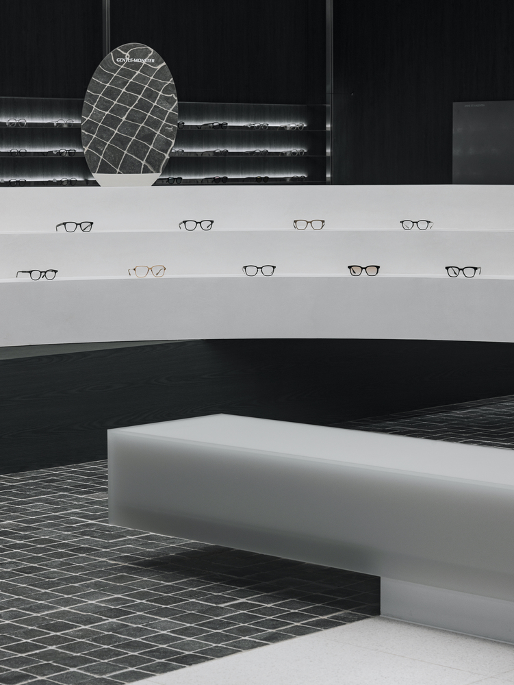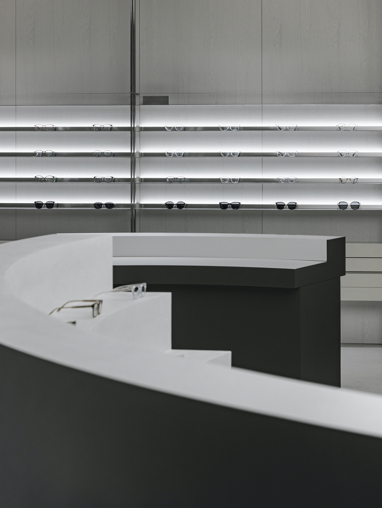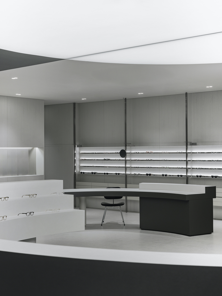 The 160-square-meter store was redesigned while maintaining the existing lens zone. To ensure a smooth transition between the eyewear and lens sales areas, the architects implemented a contrasting black-and-white palette. This monochromatic scheme not only enhances spatial clarity but also allows customers to intuitively navigate the store, distinguishing between different retail functions effortlessly.