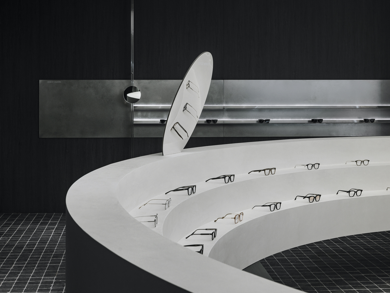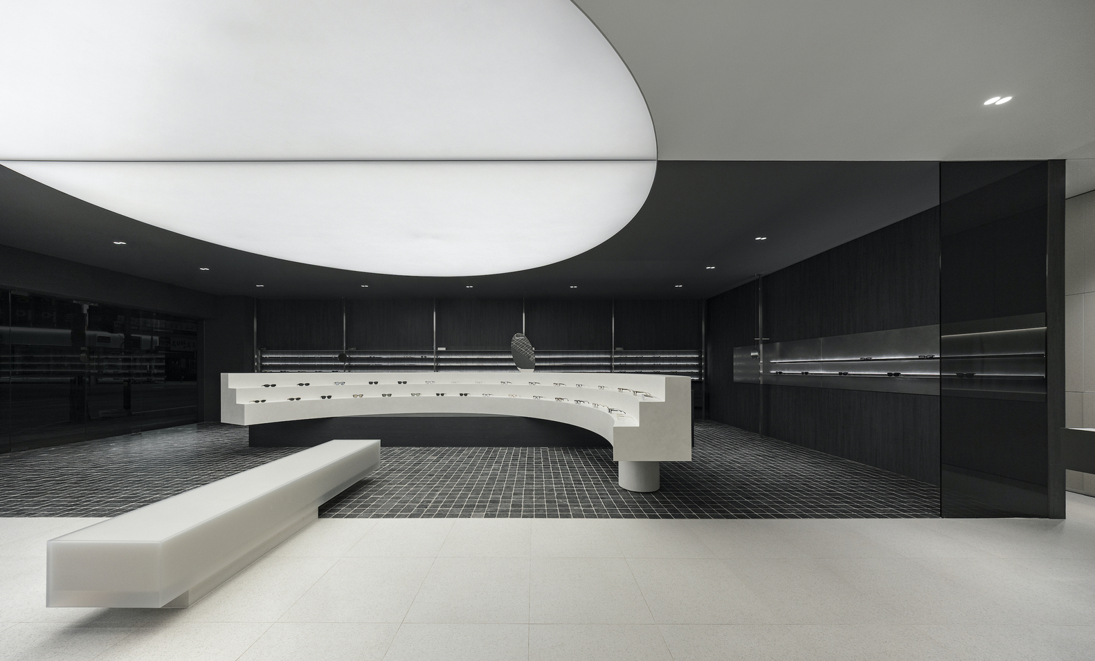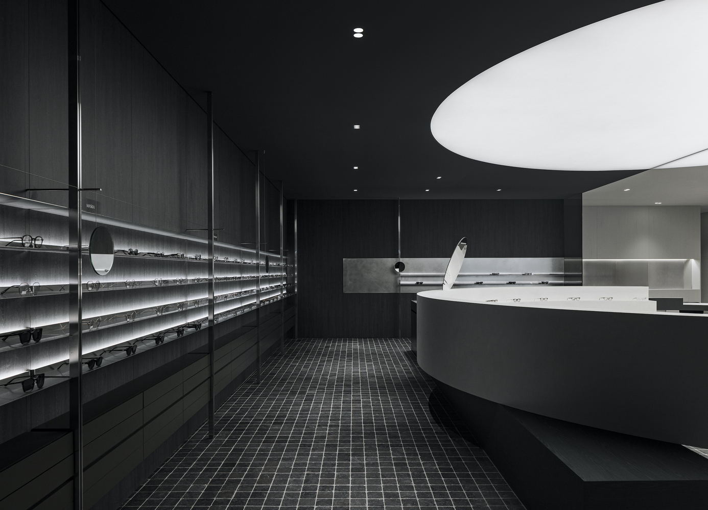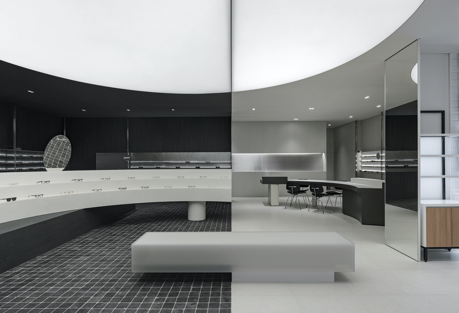The 160-square-meter store was redesigned while maintaining the existing lens zone. To ensure a smooth transition between the eyewear and lens sales areas, the architects implemented a contrasting black-and-white palette. This monochromatic scheme not only enhances spatial clarity but also allows customers to intuitively navigate the store, distinguishing between different retail functions effortlessly.