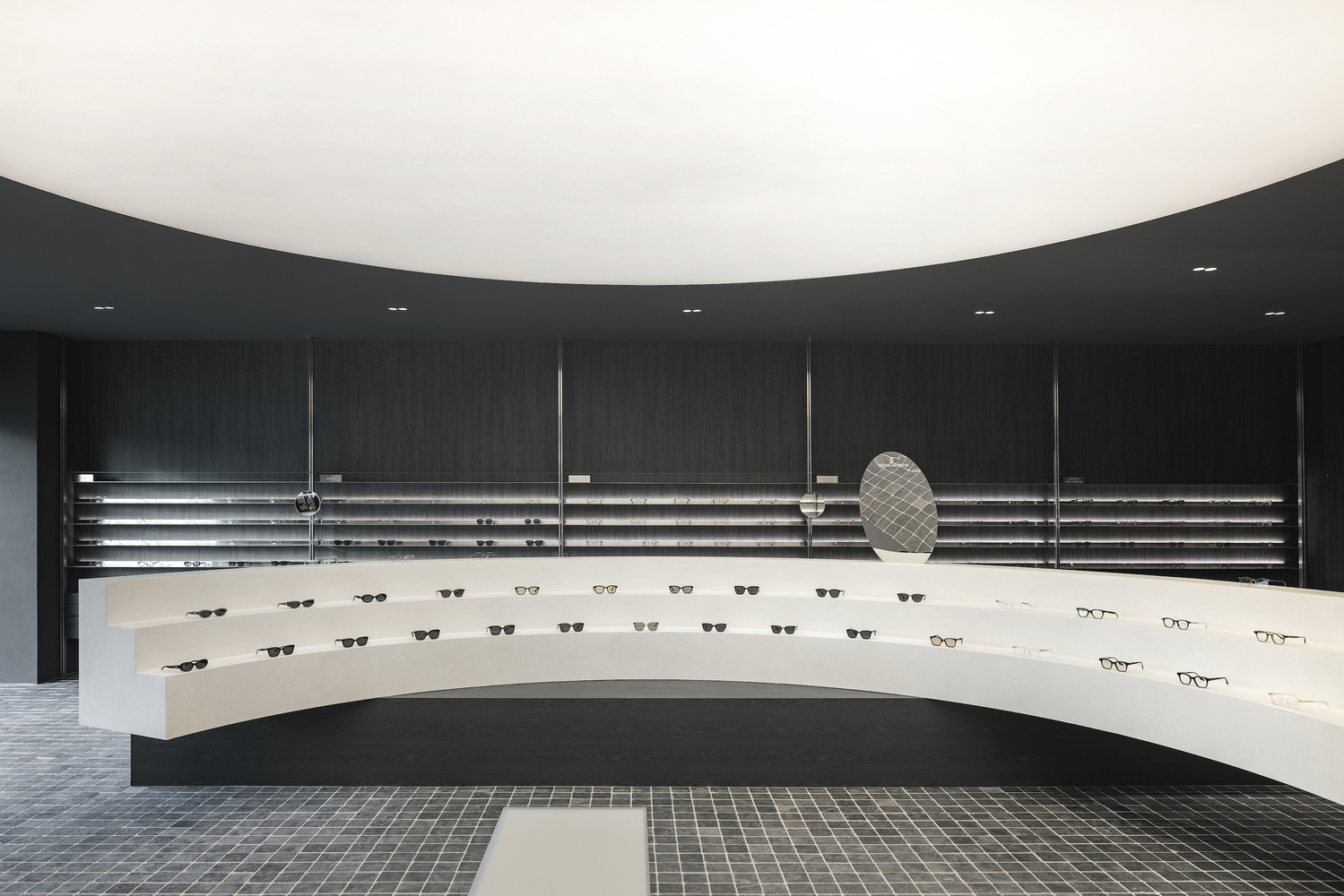 The layout prioritizes clarity and fluidity, ensuring that customers can explore products with ease. At the center of the space, two semi-circular island displays mirror the structural curves of eyeglasses, reinforcing the brand's identity. Overhead, circular Barrisol lighting enhances focus while adding depth and character to the interior.