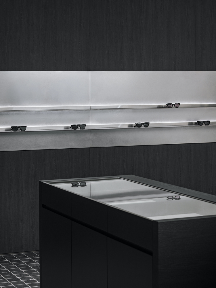 Walls are structured to reflect the assembly process of eyewear, segmenting the space into well-defined zones for various brands. The combination of simple geometric forms and strategic lighting introduces a dynamic interplay of perspectives, making the experience of moving through the store feel like a curated journey through a contemporary art gallery.