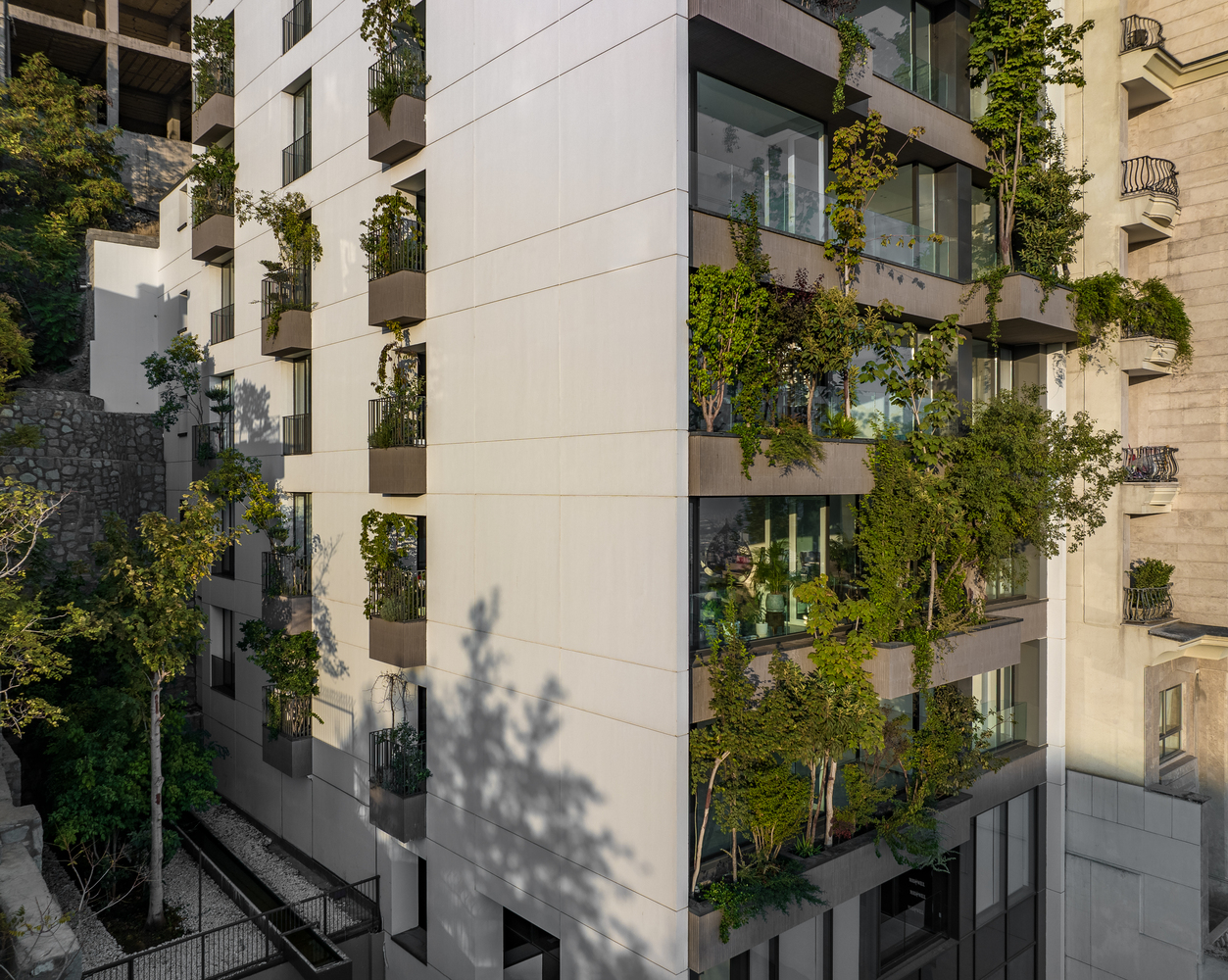 The building’s green terraces serve not only as aesthetic additions but also as natural sound barriers, mitigating the noise from the bustling city streets below. This integration of natural elements in a dense urban setting helps create a serene residential experience, where nature and city life blend harmoniously.