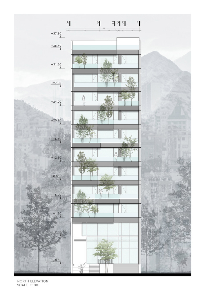 As Tehran faces the challenges of rapid urbanization, pollution, and loss of green spaces, the need for environmentally sustainable architecture has never been more urgent. Boozhgan Studio’s approach with Persica reflects this necessity by creating a vertical green space that spans multiple floors, turning the building into a “green oasis” amidst the concrete landscape. By choosing resilient plant species from Iran’s Hyrcanian forests, the design incorporates native flora that thrives in Tehran’s climate while minimizing maintenance.