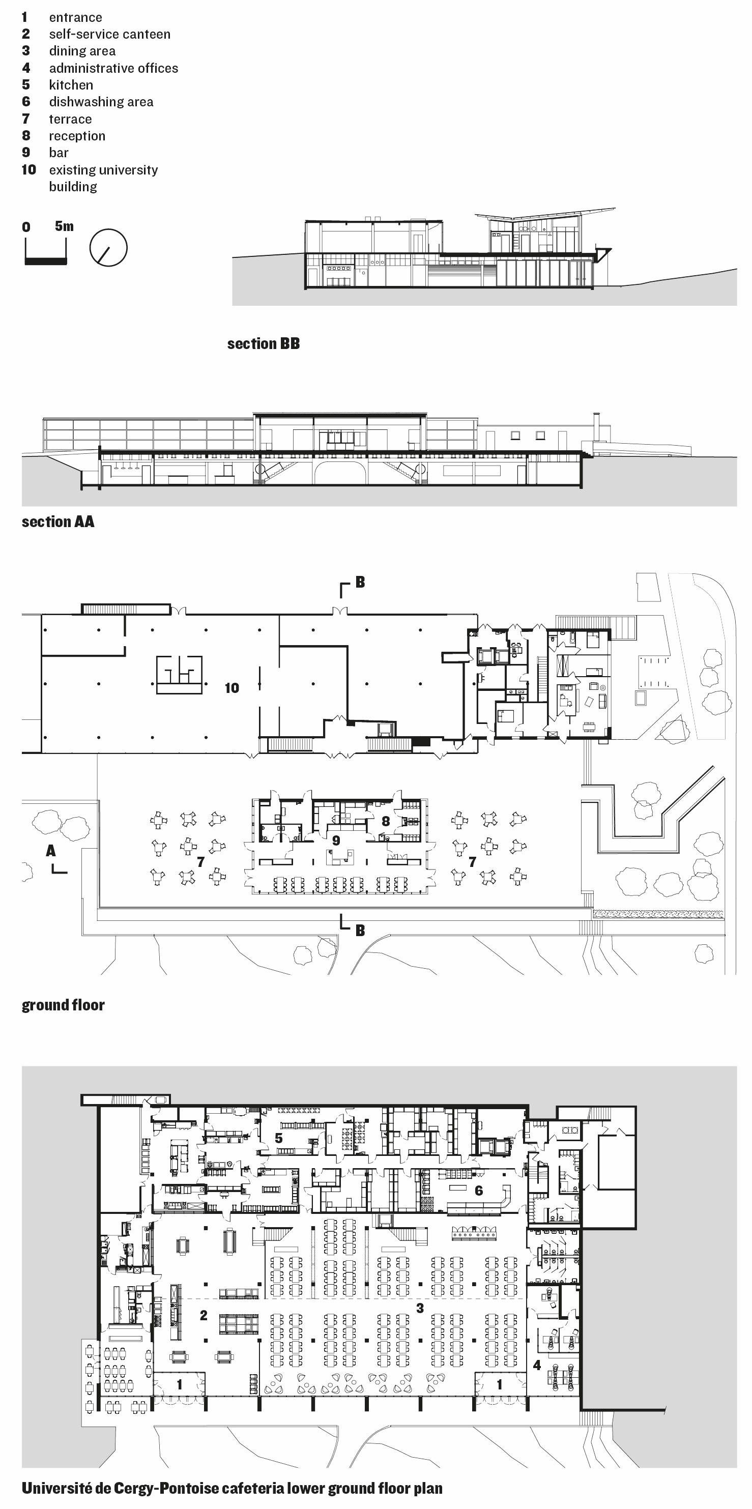 Similarly, the distinctive roof of the university cafeteria in Cergy-Pontoise, completed in 2021, is shaped like a visor and uses less material than if it were supported by columns. Instead, thick wooden beams on the interior of the building hold the roof in its angled position, resembling an opened envelope.