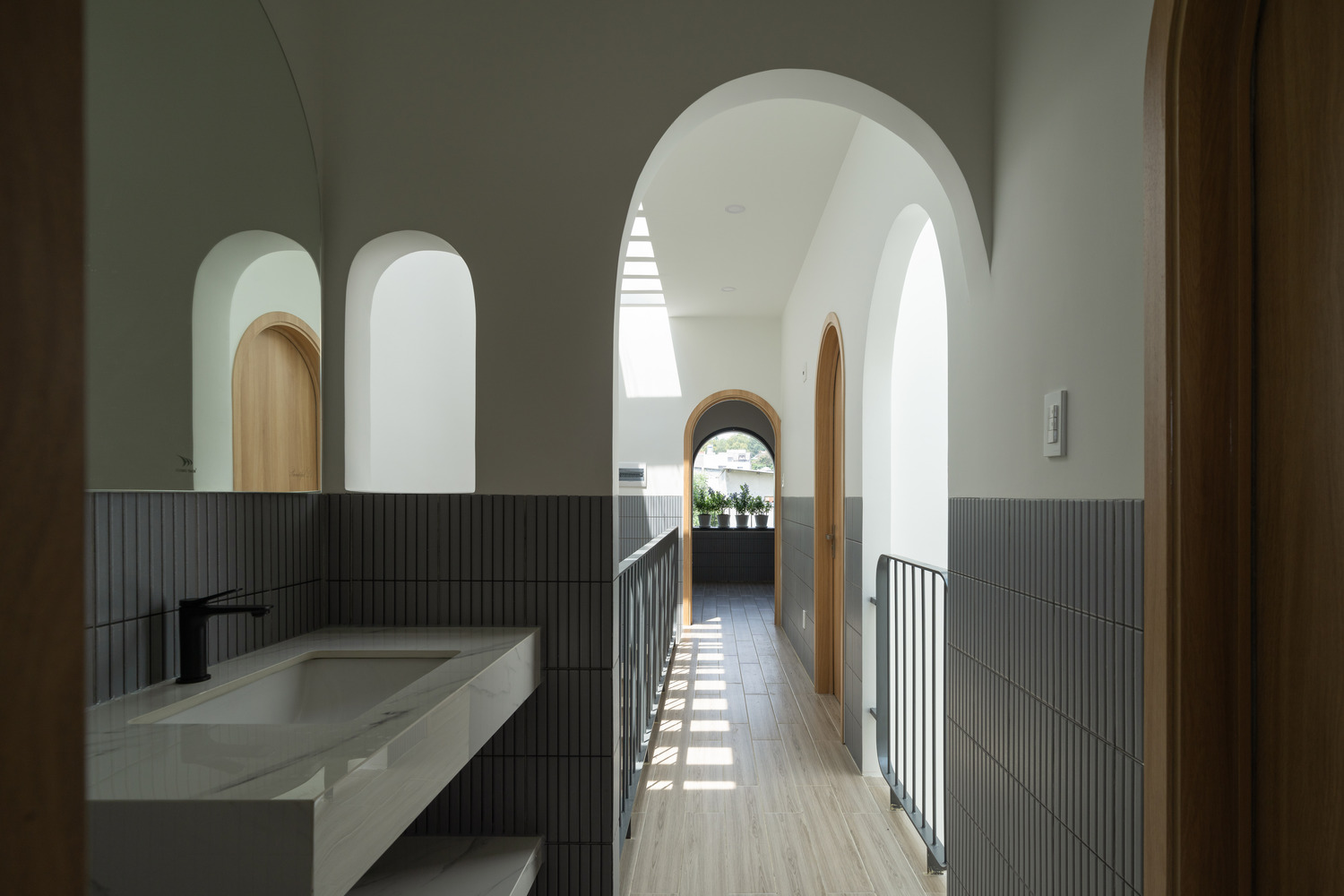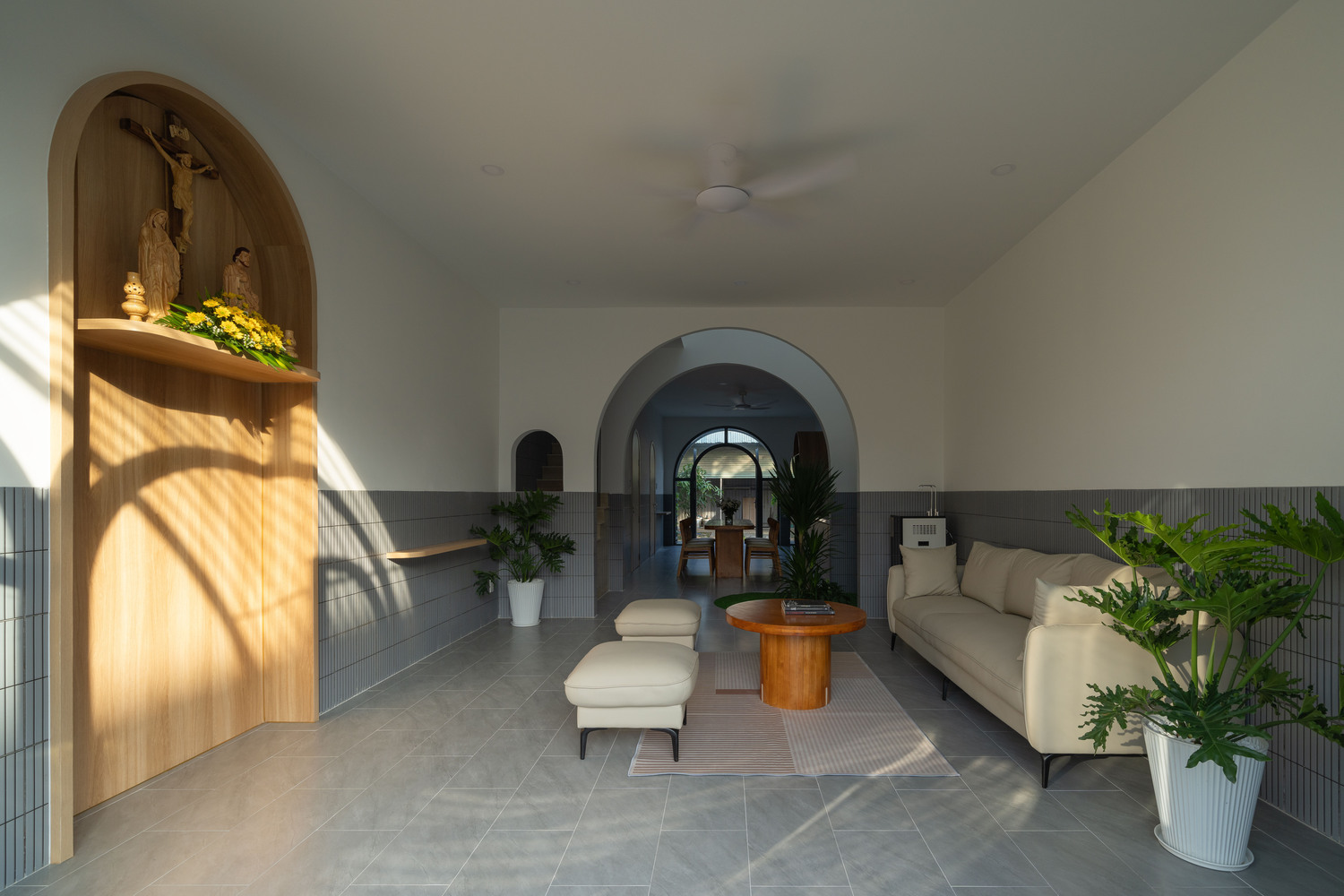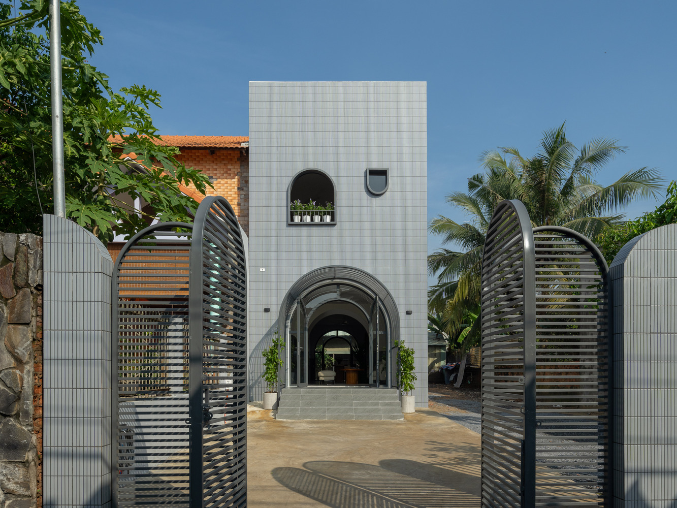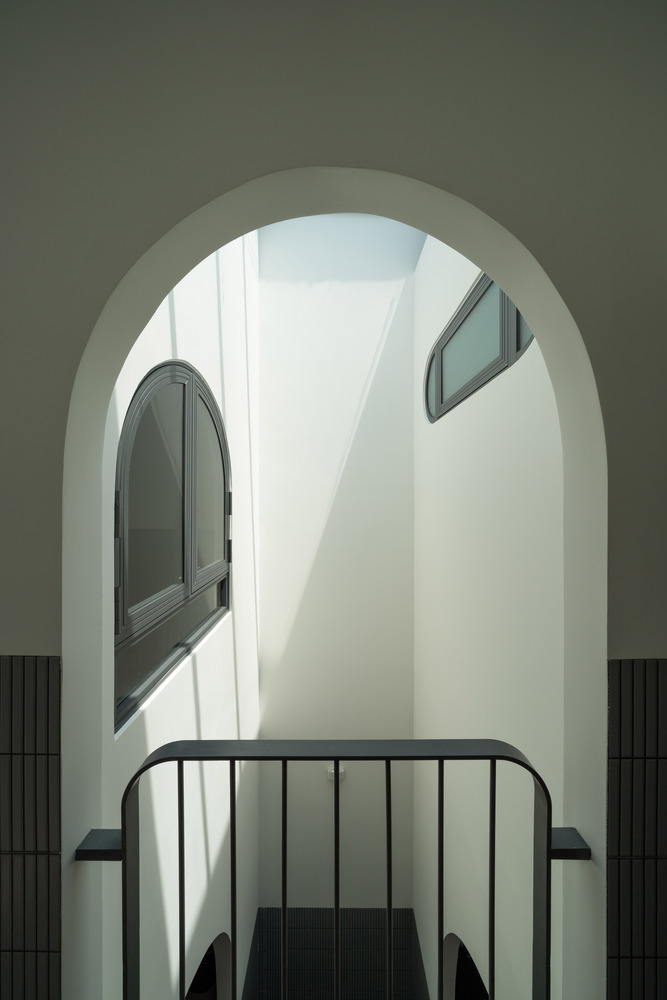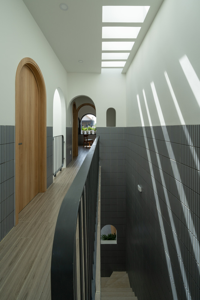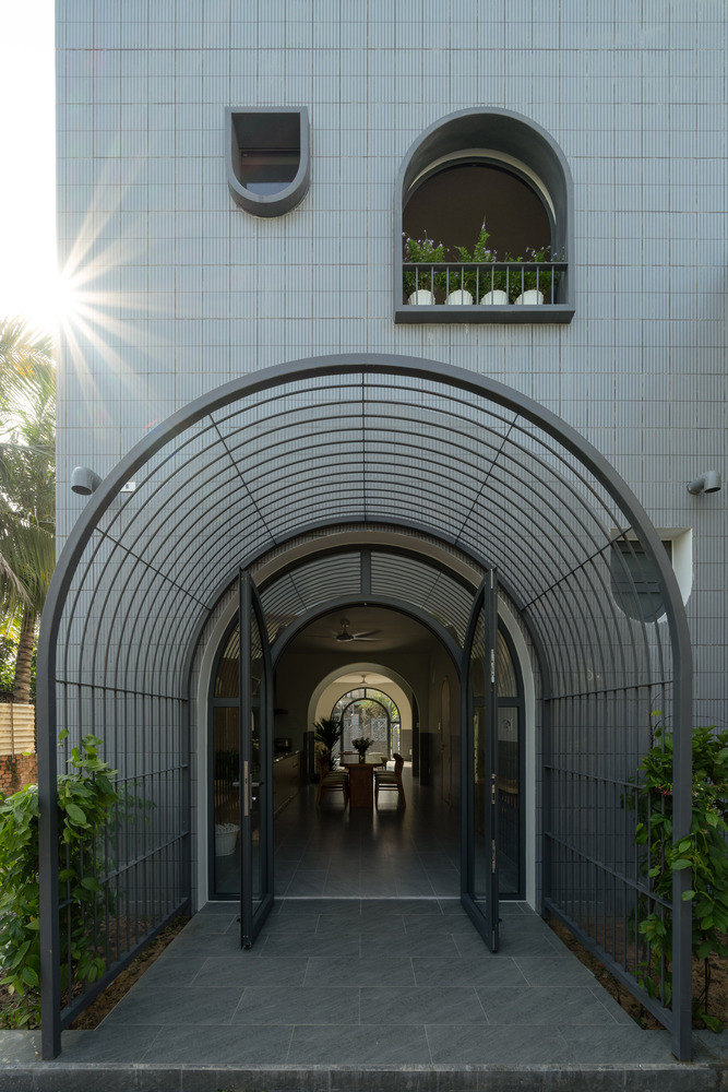 The facade of Hoa House features a series of covered, arched entryways that create a visually appealing exterior while maximizing interior space. Designed without balconies, the facade instead uses climbing plants to add a natural touch to the otherwise minimalist appearance. The arched design also lends a sense of privacy and introduces a traditional architectural element that complements the home’s contemporary style.