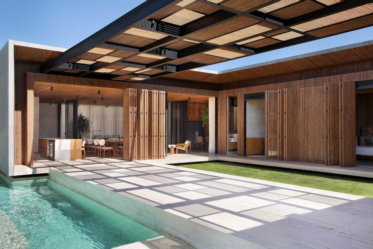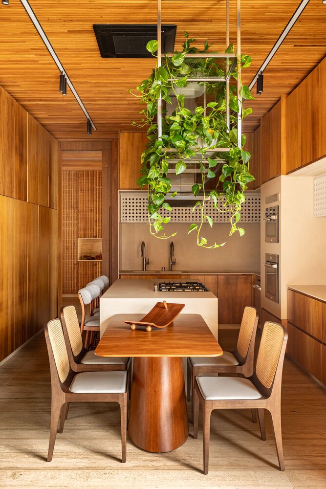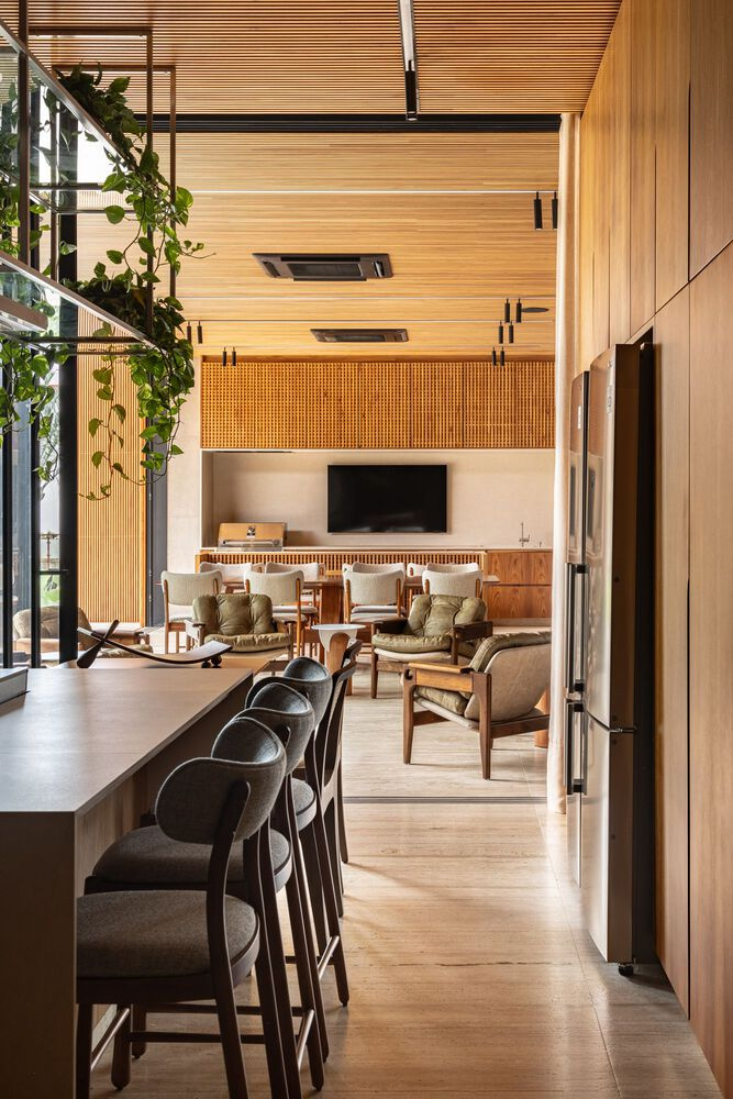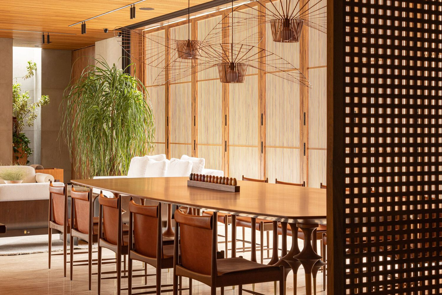 Natural materials, especially wood, guide the composition. Freijó wood panels, muxarabi screens, and bespoke furnishings define both texture and tone throughout the home, weaving continuity from outside to inside.