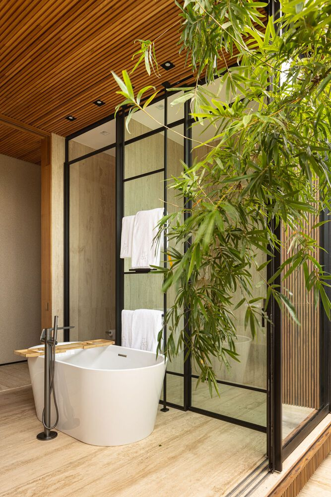 The bathroom attached to the suite opens onto a secluded garden, blurring the line between architecture and landscape. Natural ventilation and daylight animate even the most intimate moments of the house.