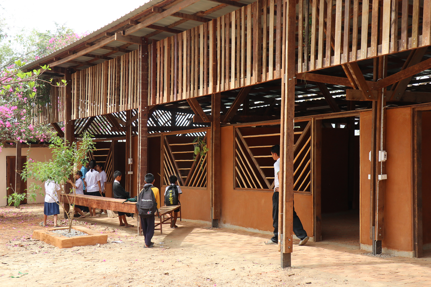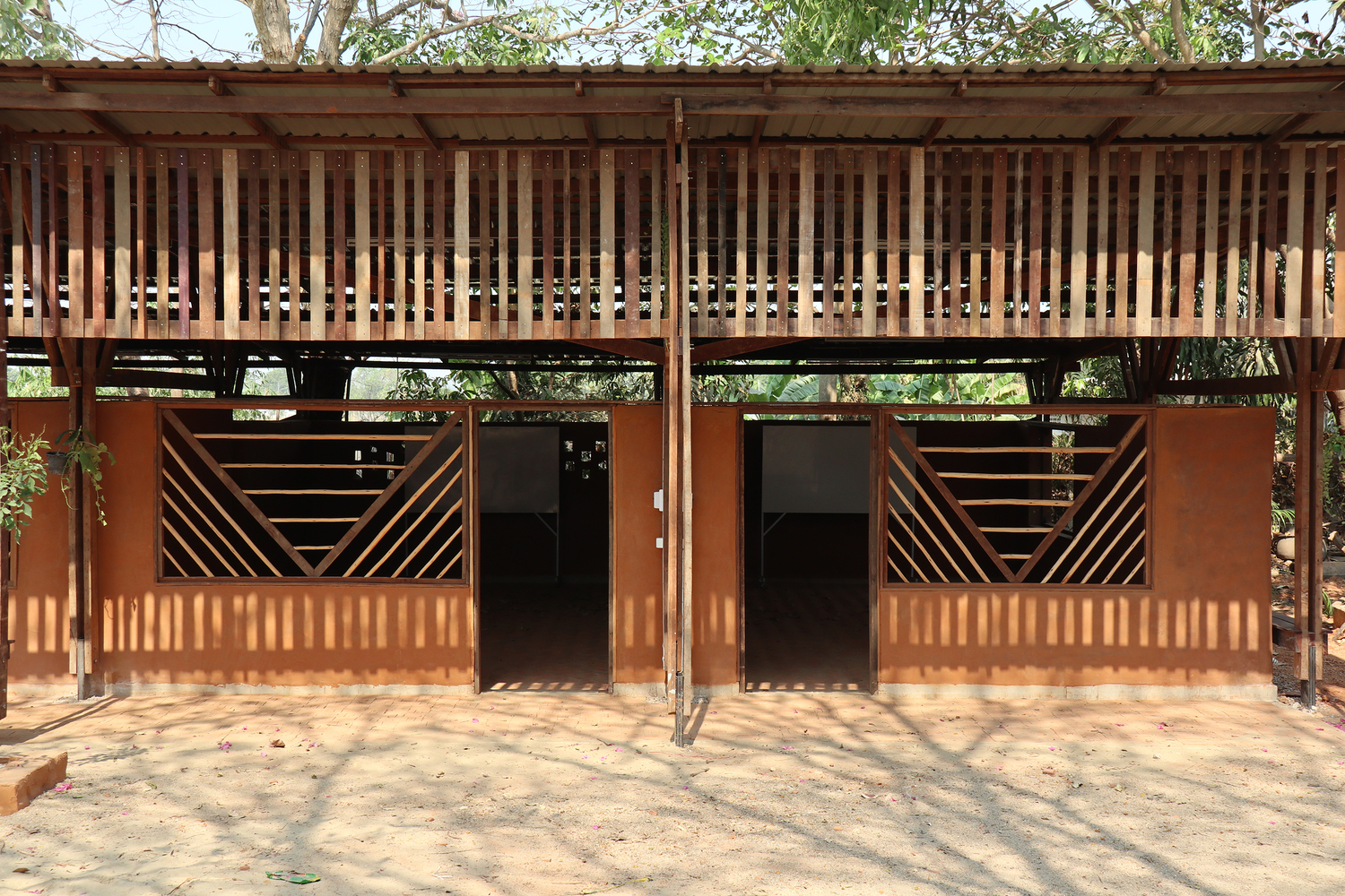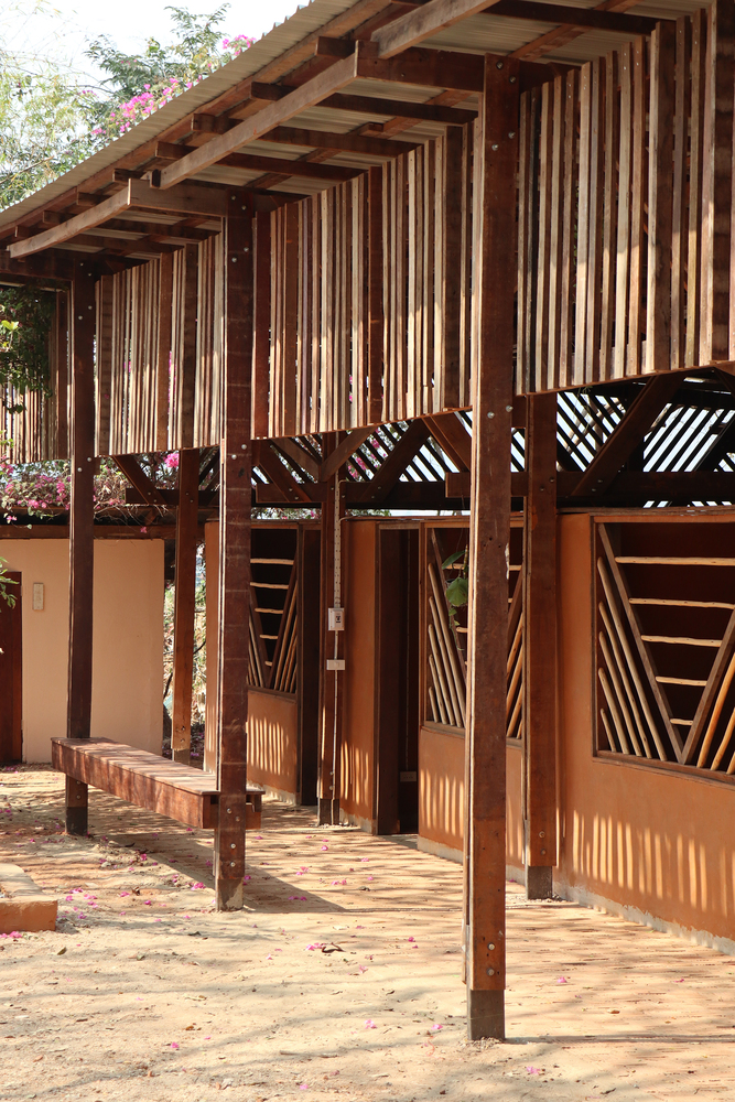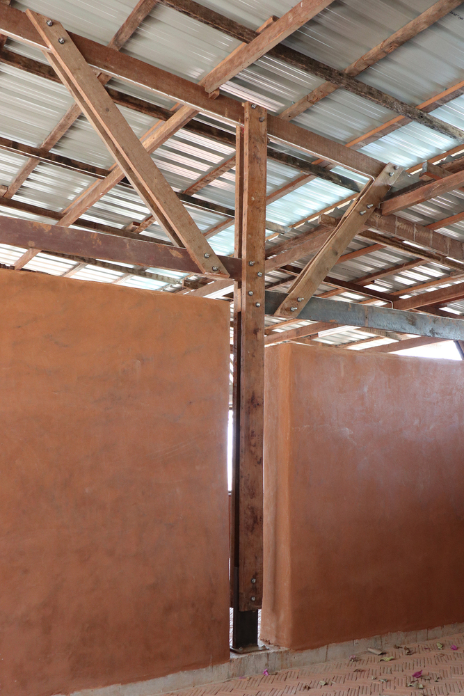 Adobe bricks and reclaimed wood form the primary building materials of the school, chosen for their low environmental impact, affordability, and climatic suitability. The soil from the site, rich in clay content, was mixed with rice husk to produce around 4,500 adobe bricks in just four weeks. For external walls, a protective coating made from tapioca starch, fine sand, and local soil enhances water resistance and durability. These materials not only reduce the school’s ecological footprint but also create a naturally cool and comfortable indoor environment.
