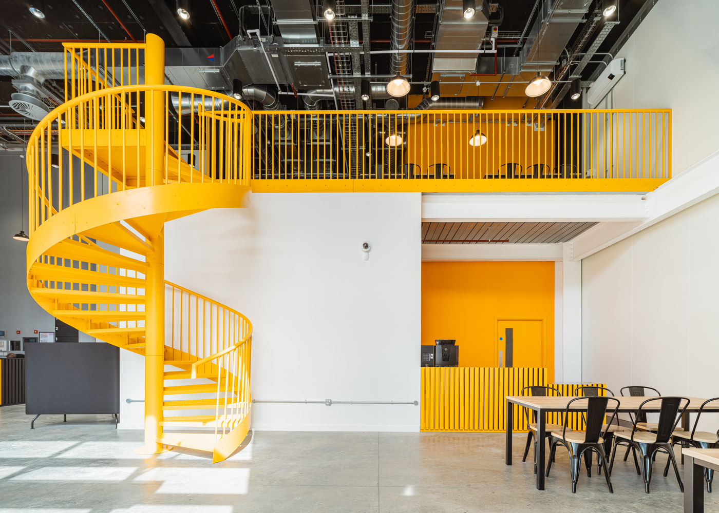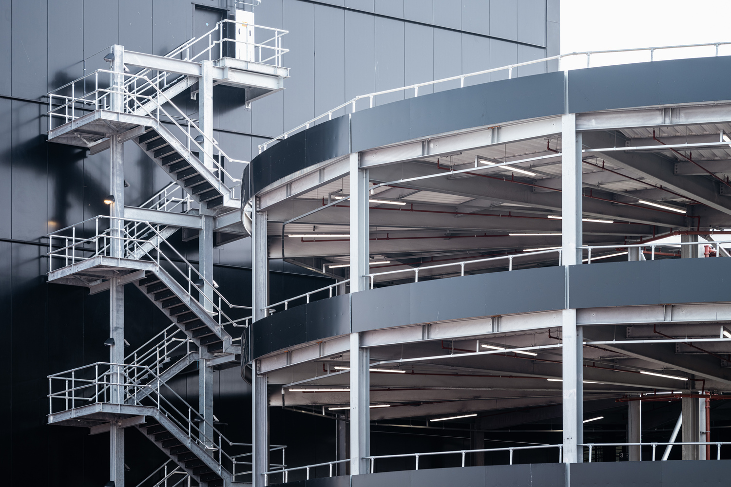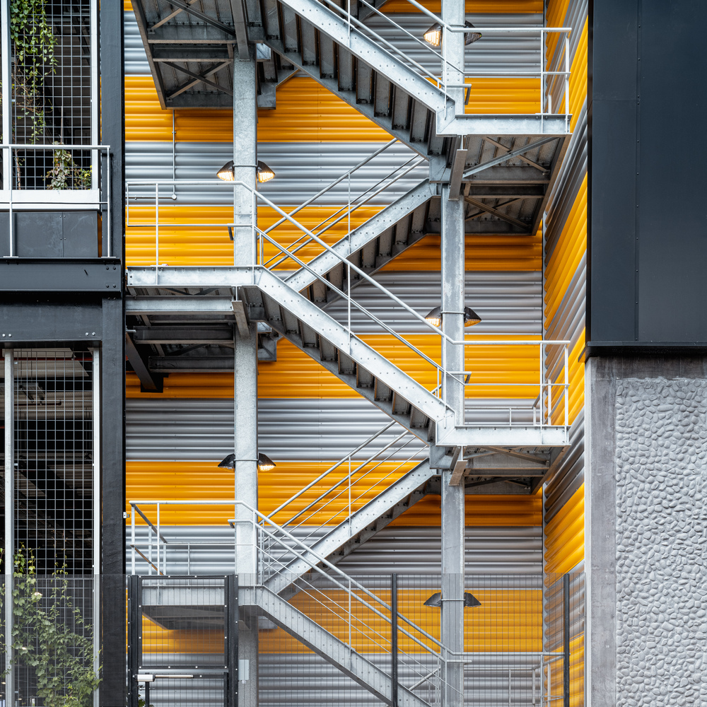 Haworth Tompkins collaborated with DNCO, a leading branding agency, to develop bold industrial-inspired elevations, effective wayfinding, and a distinctive graphic identity. The corrugated metal paneling, combined with a silver and yellow checkerboard motif, reflects the industrial heritage of the area, drawing inspiration from the helical vehicle ramp logo.