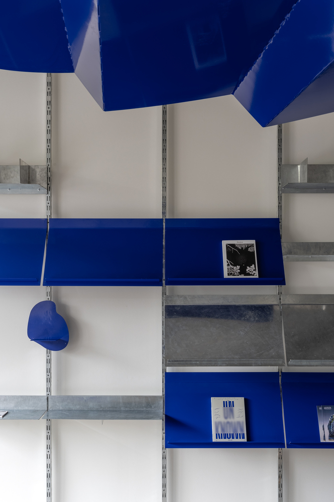 The side walls of the bookstore are equipped with an adjustable shelving system. These shelves, supported by vertical pillars, are designed to accommodate books, magazines, and merchandise of various sizes. The modular nature of these shelves enhances the store's adaptability, aligning with the dynamic inventory of design-oriented publications.