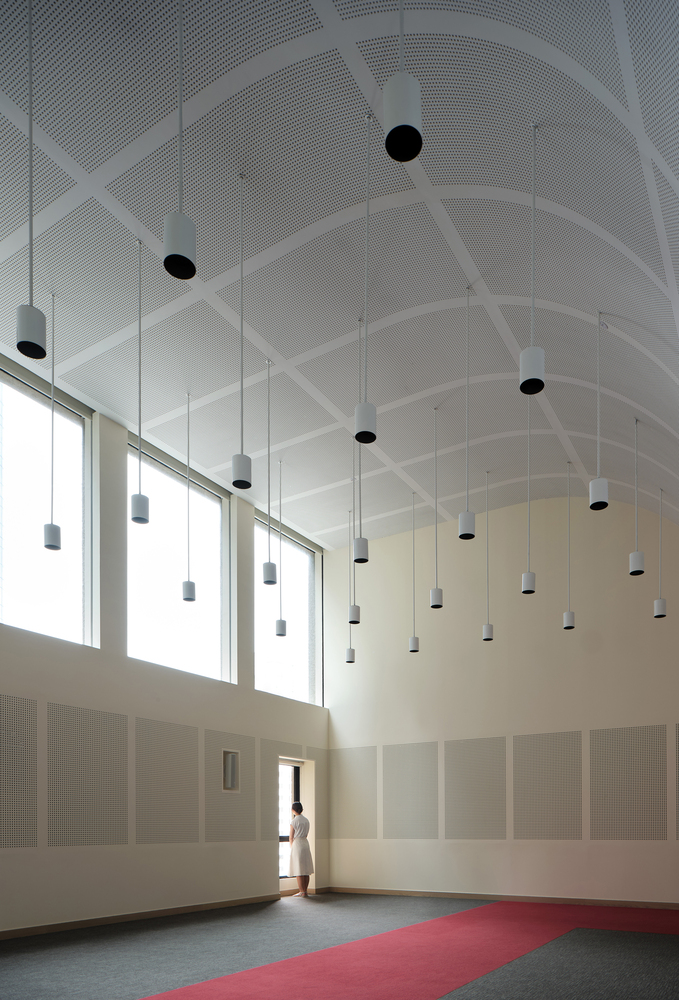The innovative use of interspersed courtyards throughout the building creates diverse environments for discourse, relaxation, and engagement. These green spaces not only offer a pleasant area to linger but also encourage contemplation and inner transformation by fostering a close communion with nature.