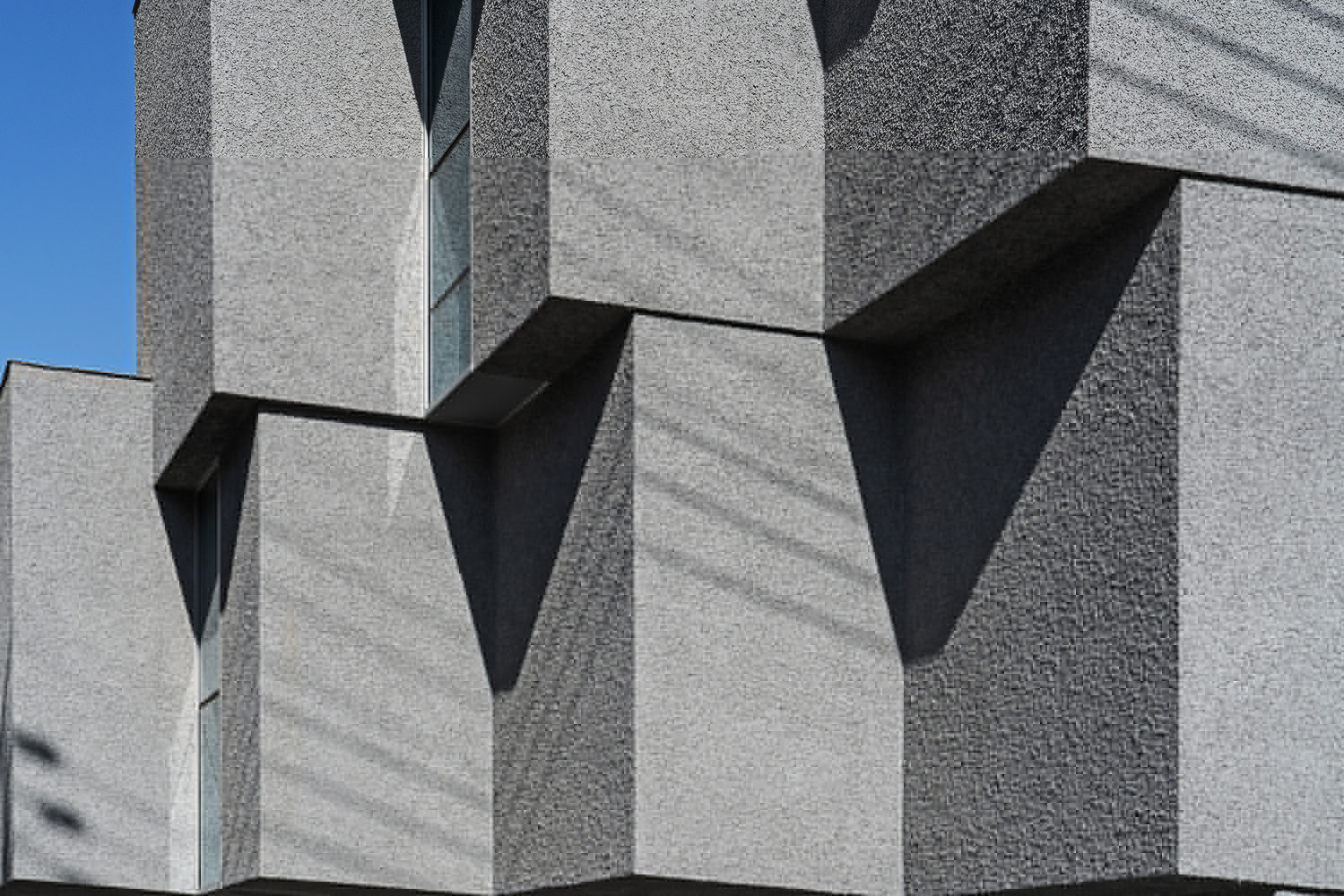 The building presents two major facades, each telling a story of tension and harmony. The first facade, characterized by its slim profile that widens with height, brings a visual and structural tension that captures the eye. The second, composed of several cubes, offers a dynamic interaction with the cityscape through the ever-changing play of light and shadow.