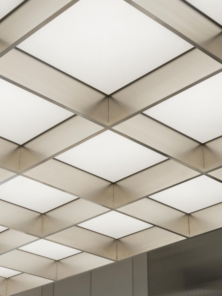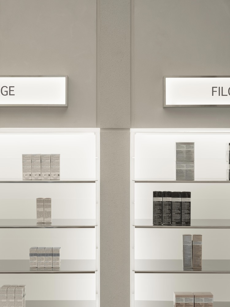 The lighting design was meticulously planned to create a balanced and inviting environment. The direct lighting was achieved through a grid box system with individual light boxes that evenly illuminate the entire space. Indirect lighting, such as the soft hidden lighting behind the wall shelving, highlights the products on display and adds depth to the overall design.