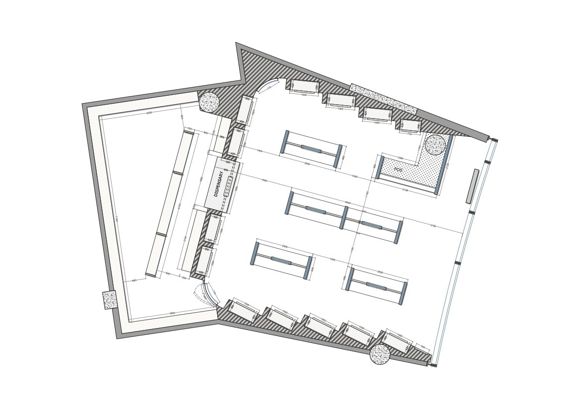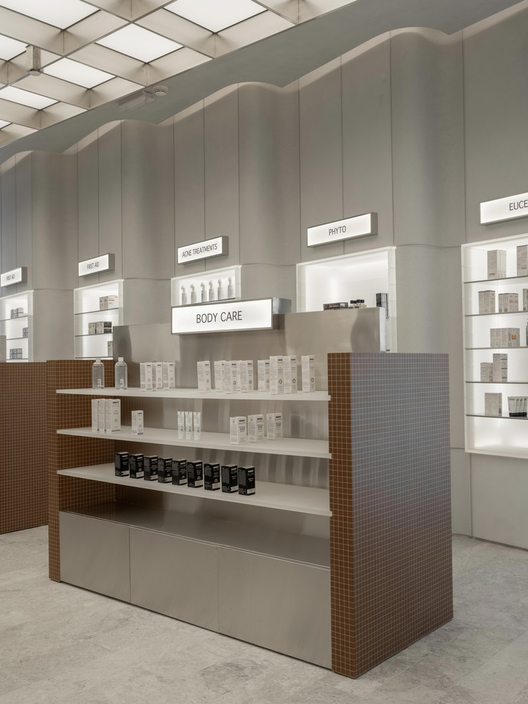To optimize the layout, the design prioritized ease of navigation and clearly lit signage. The wall shelving was integrated into the walls and placed at an angle, allowing customers to see all the different categories as soon as they enter the pharmacy. This strategic placement enhances the shopping experience by making it intuitive and efficient.