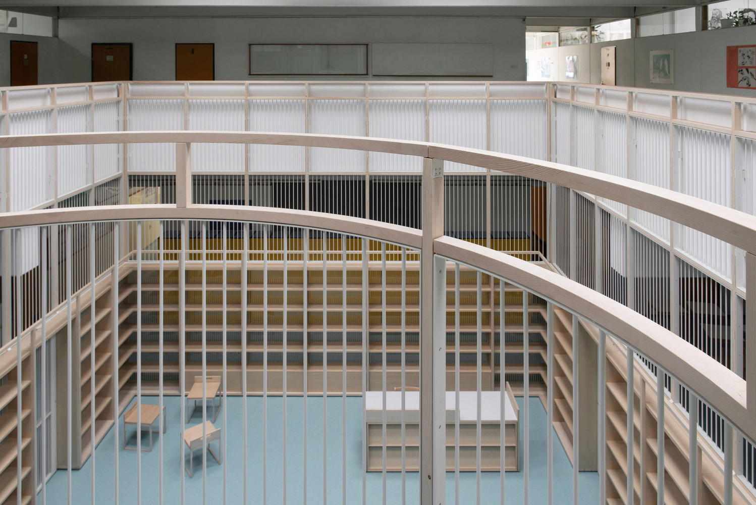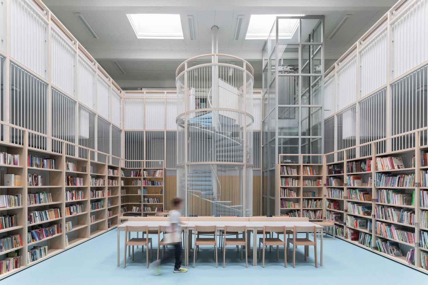 The integration of the library into the school's central communal area allows for continuous interaction with educational resources, transforming the way students perceive and engage with the library. It becomes a living part of their daily school life, significantly enhancing their educational experience.