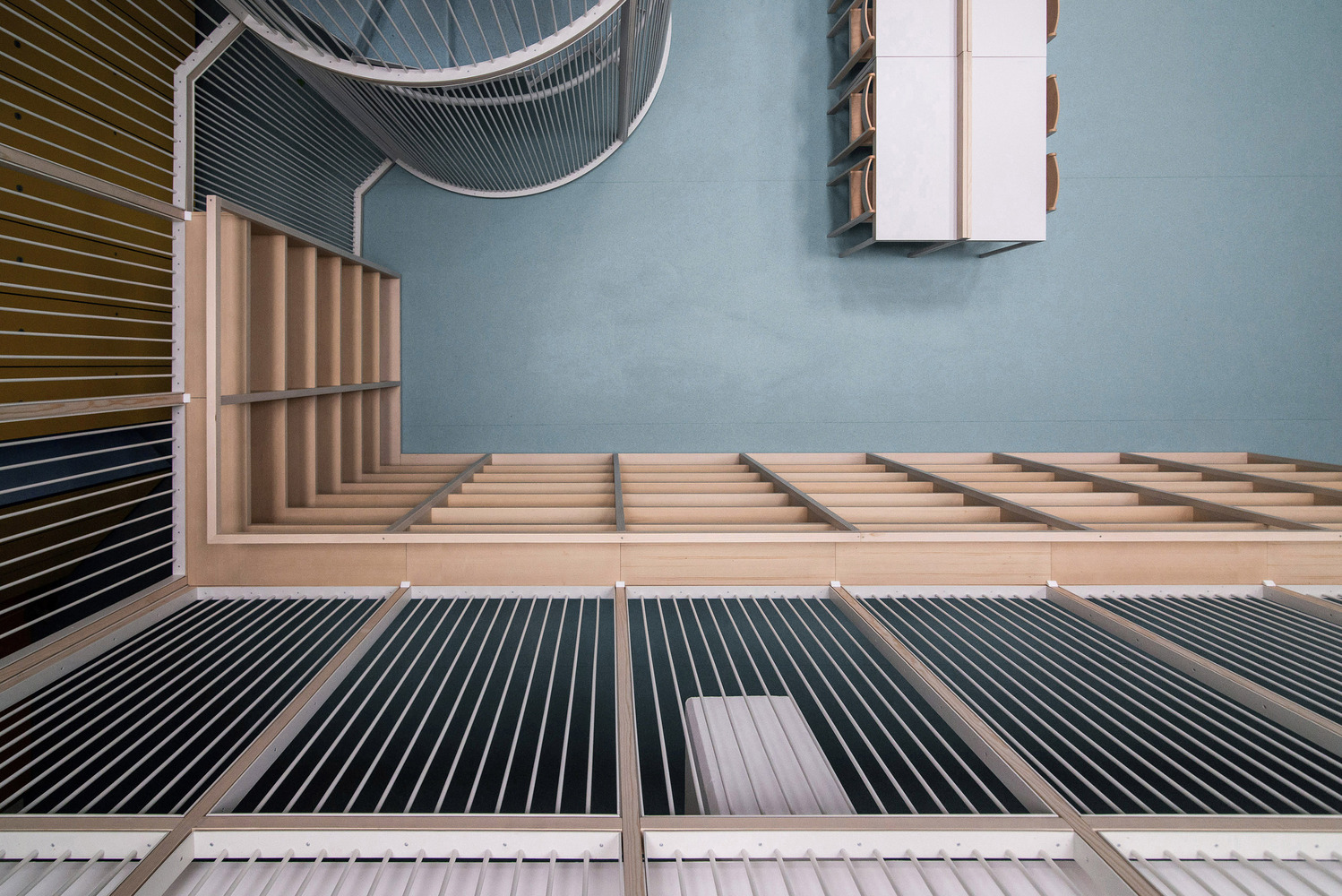 The Open Library is uniquely designed to encircle the perimeter of the two-story hall, allowing books to be visible from various points within the school. This layout not only makes the library the focal point of the school but also maintains the hall’s role as a communal space, now enriched with the presence of books.