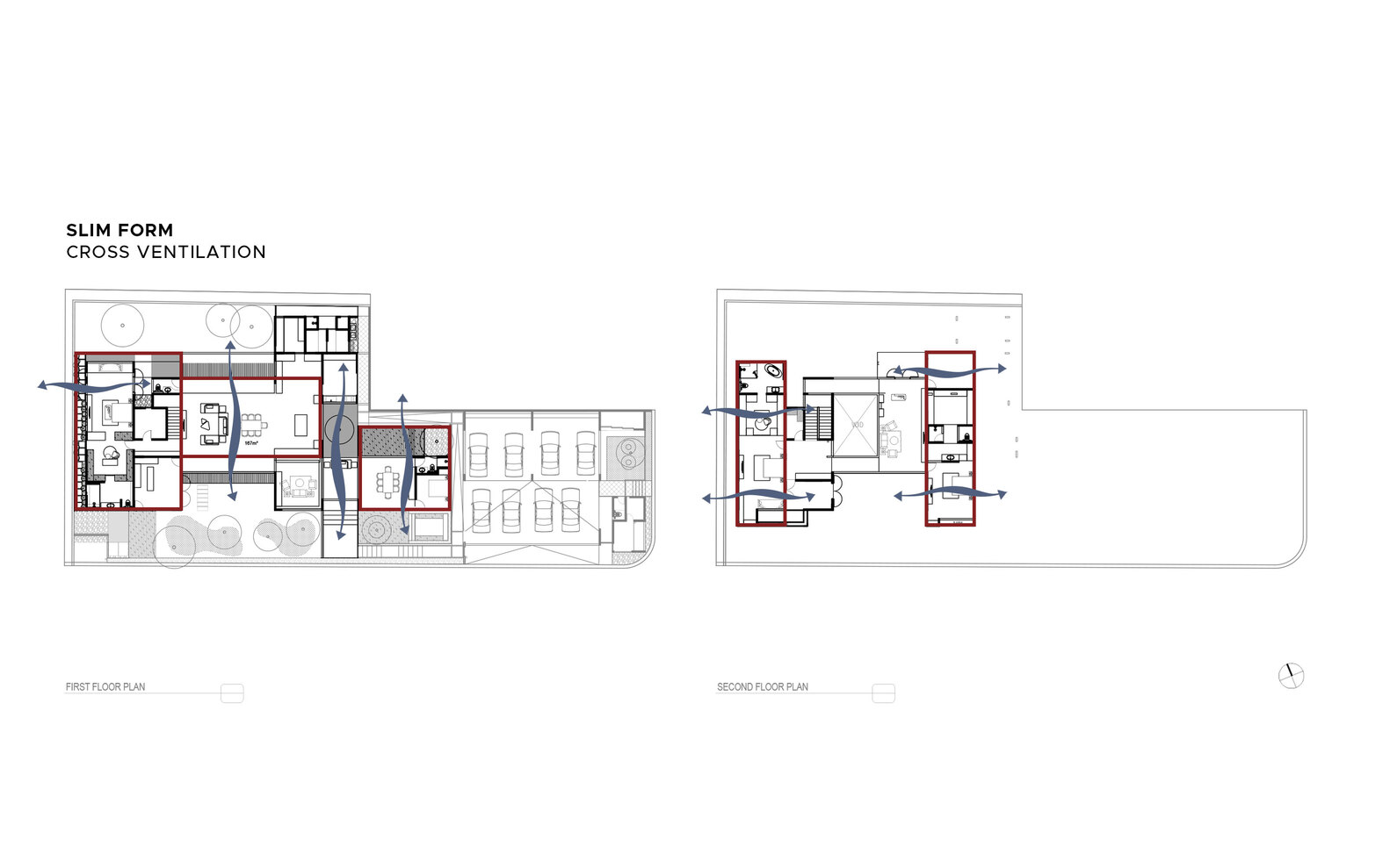 The Grande House stands as a testament to the harmonious balance between architectural innovation and the natural environment. With a 56-meter façade that welcomes sunlight and promotes natural ventilation, the design focuses on creating a comfortable living space that reduces energy consumption. The house's orientation and structure are meticulously planned to harness the south winds, enhancing the natural cooling effect throughout the property.