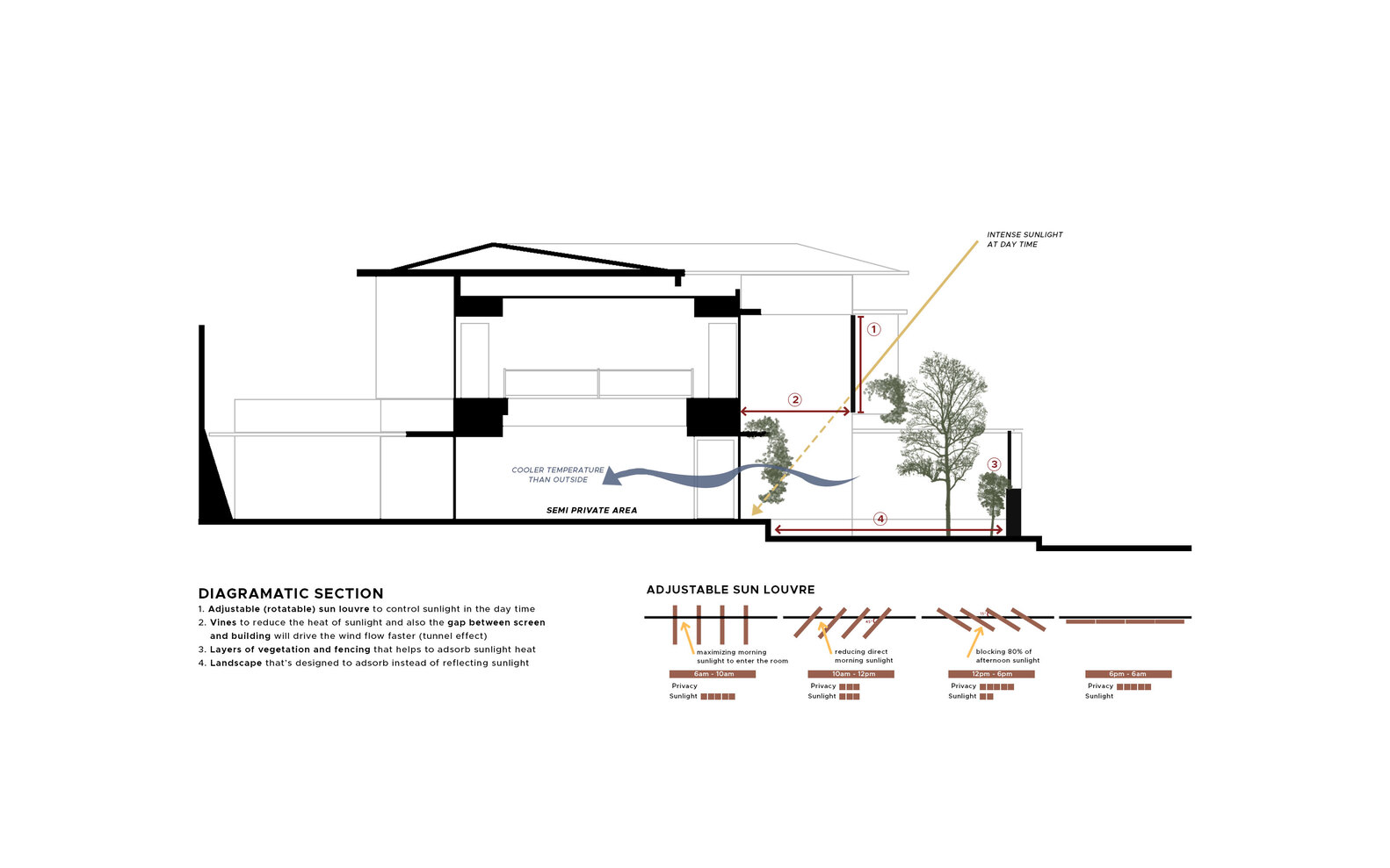 Innovative solutions like adjustable louvers, green walls, and strategic landscaping are integral to the house's design, offering shade and privacy while minimizing the urban heat island effect. A reflective pool adds to the cooling, further reducing the reliance on air conditioning. The use of renewable energy sources and a greywater recycling system for garden irrigation underscore the commitment to sustainability.