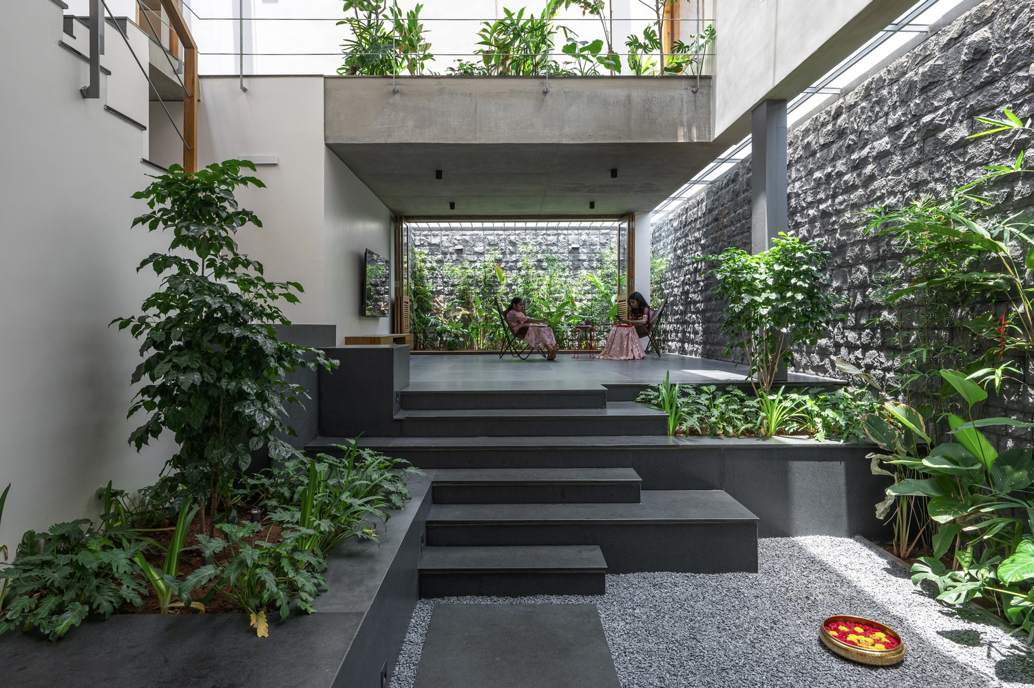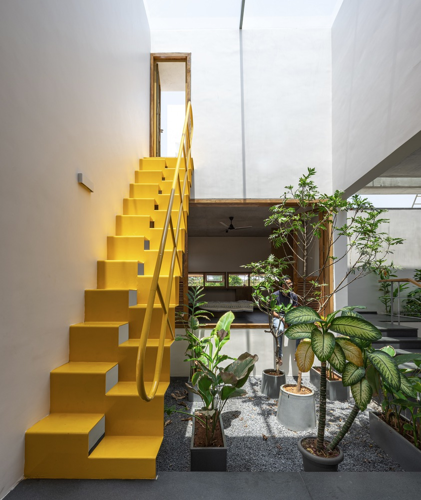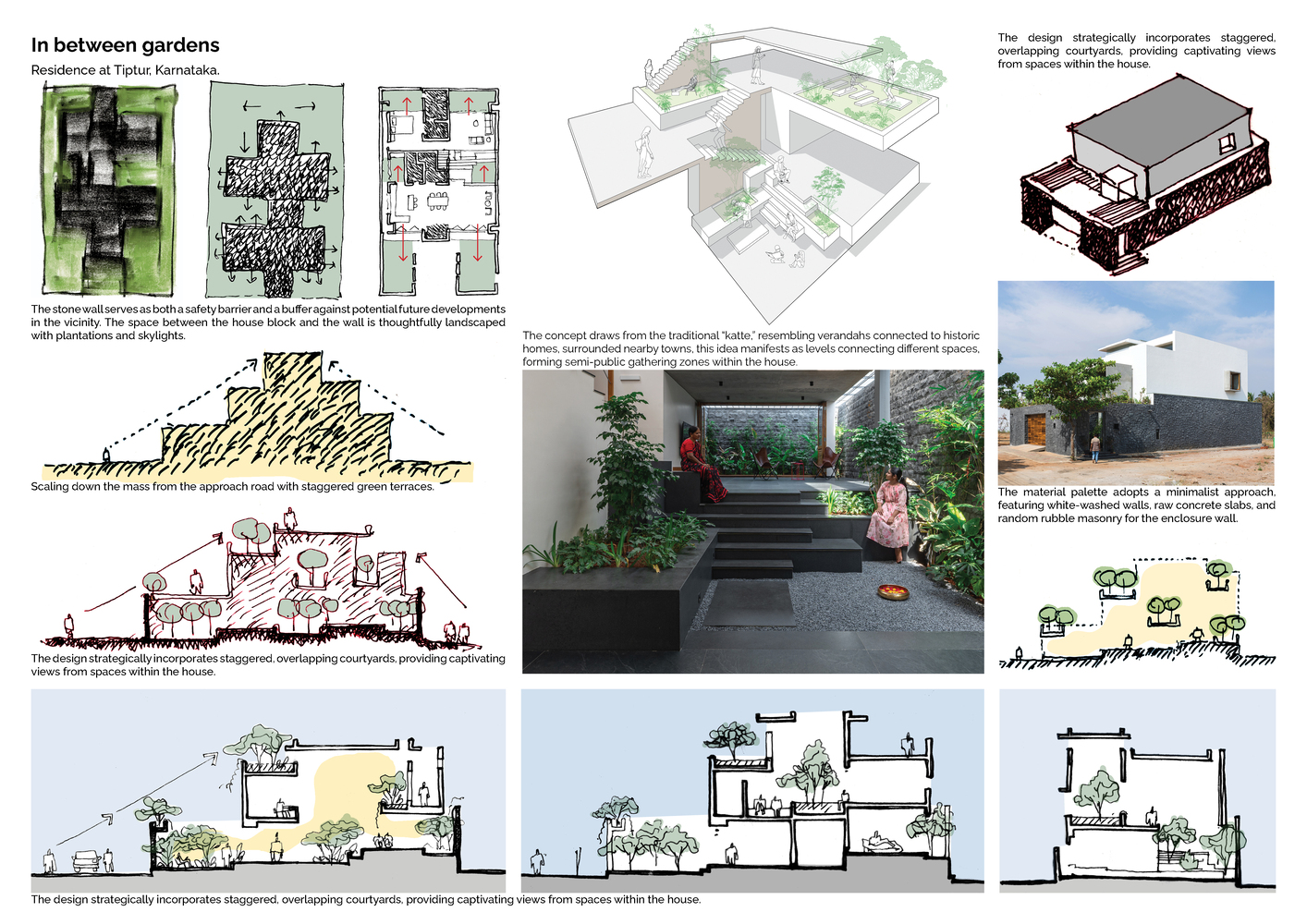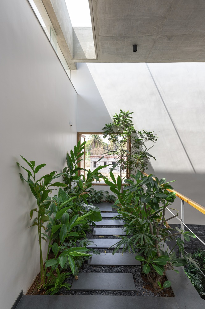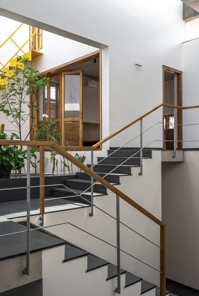Drawing inspiration from the traditional "katte" found in the old town of Tiptur—verandas that foster community interactions—the residence incorporates staggered, interconnected courtyards that serve as semi-public gathering zones. These spaces are thoughtfully designed to transition smoothly from indoor areas to lush outdoor gardens, enhancing the communal feel while providing seclusion.