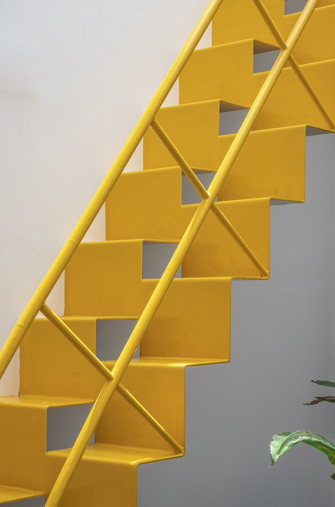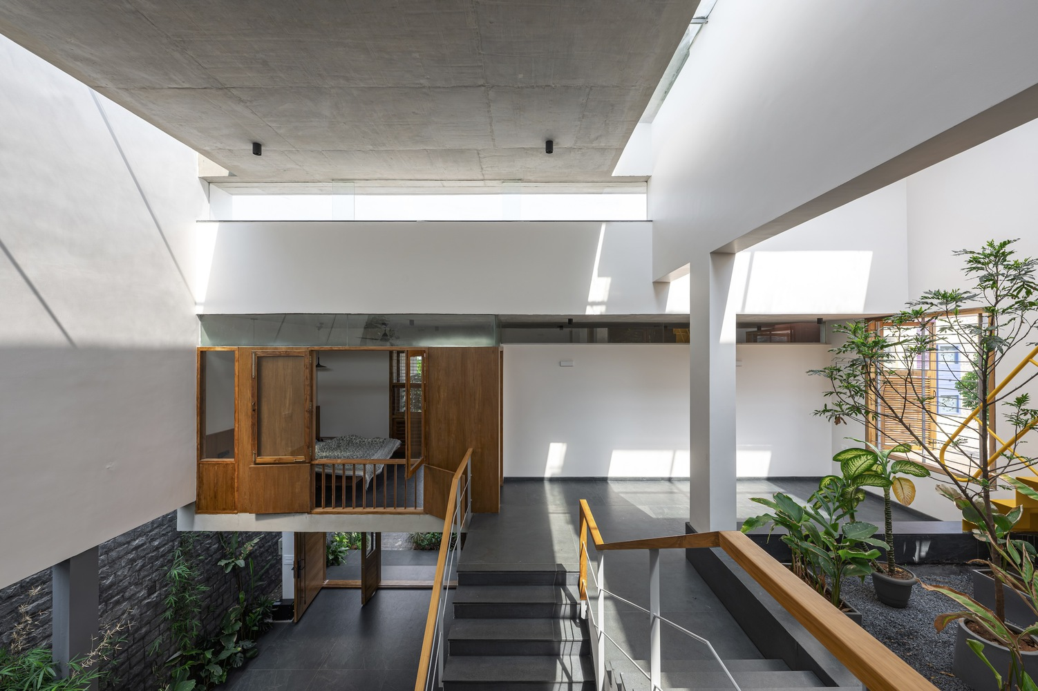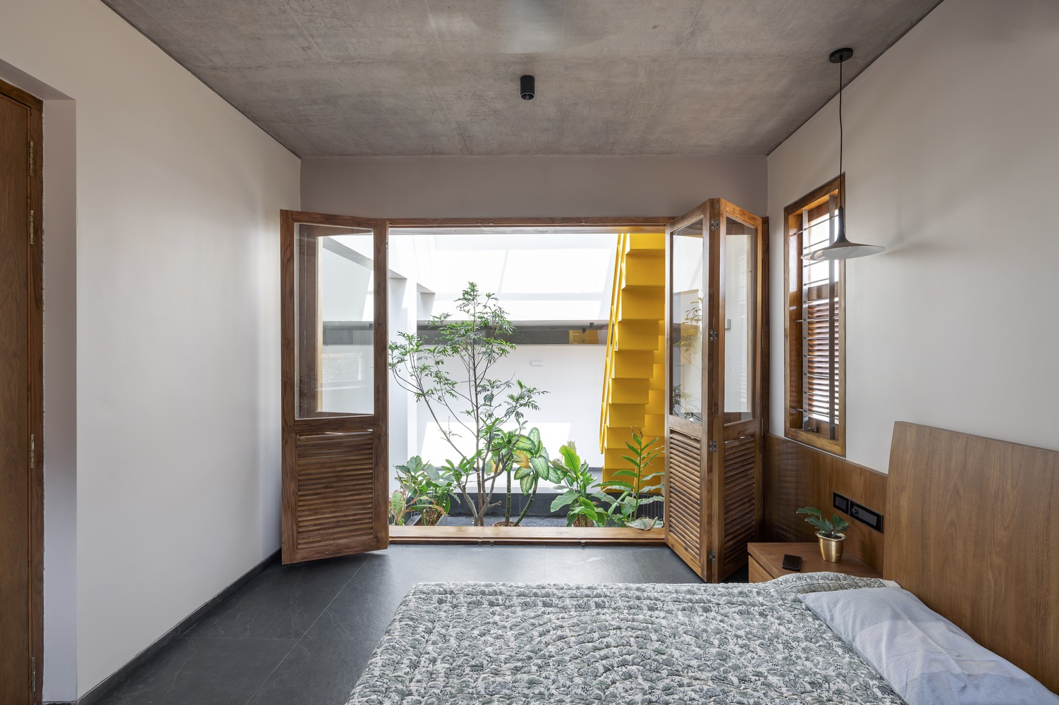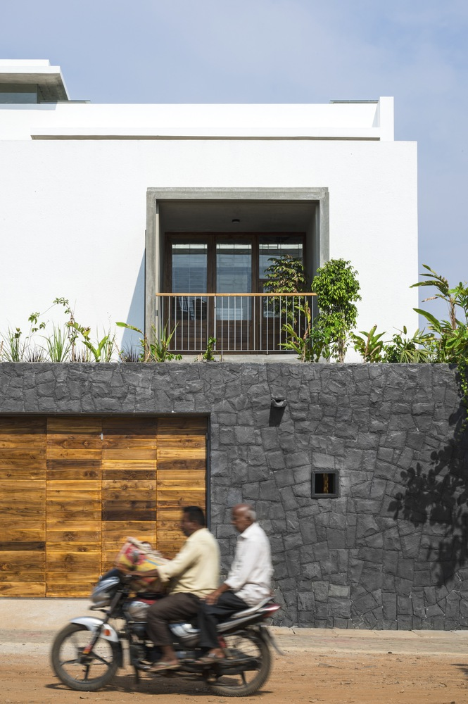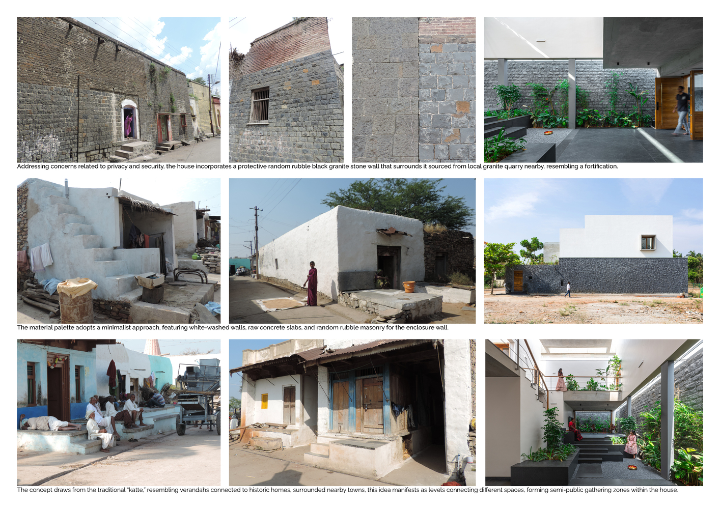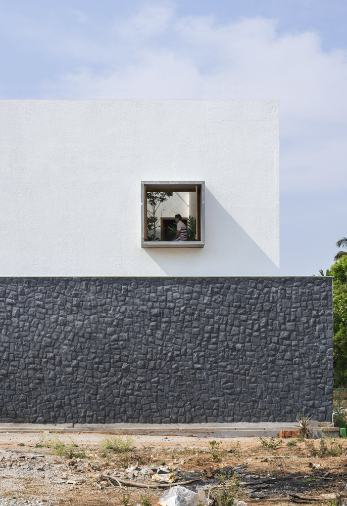 The material palette is a homage to Tiptur’s local resources, featuring white-washed walls for brightness and heat reflection, raw concrete slabs for modern minimalism, and the distinctive black granite. These materials are not only sustainable but also resonate with the regional aesthetic, ensuring the residence blends seamlessly with its cultural and environmental backdrop.
