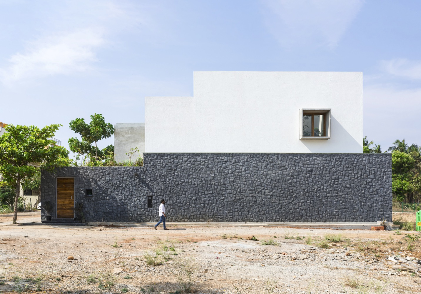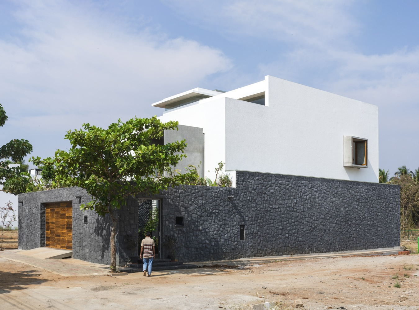 Situated on a 4200 m² corner plot in a newly developed area of Tiptur, the residence is designed with privacy and security in mind, using local materials and landscaping to create a protective yet inviting environment. The design tackles the lack of immediate architectural context by constructing a self-contained oasis.