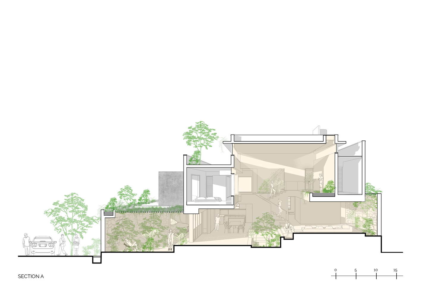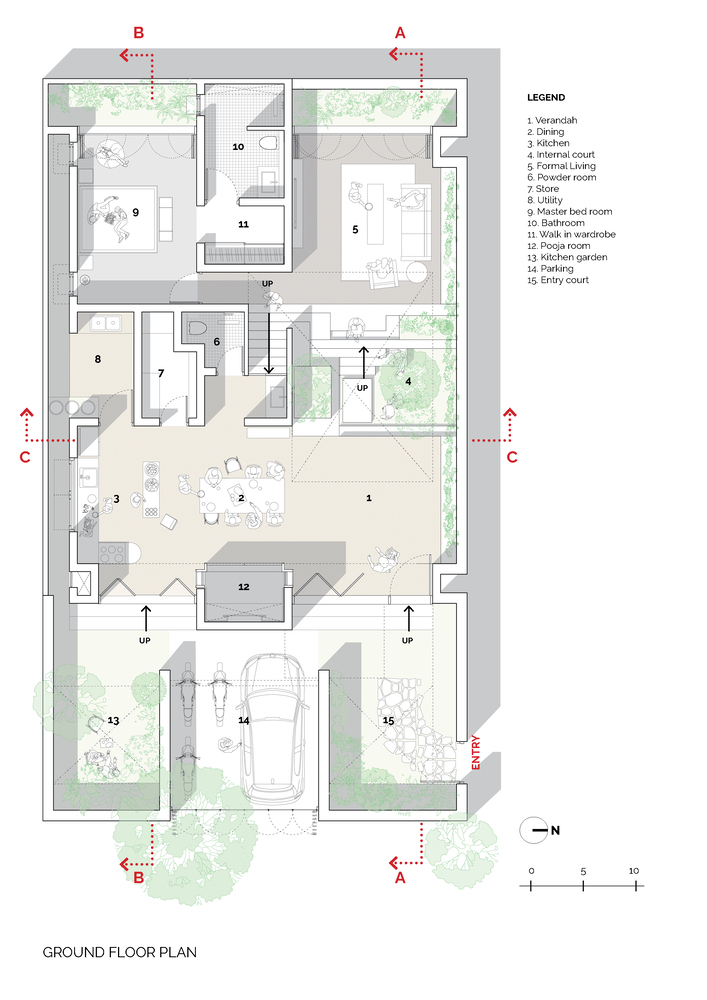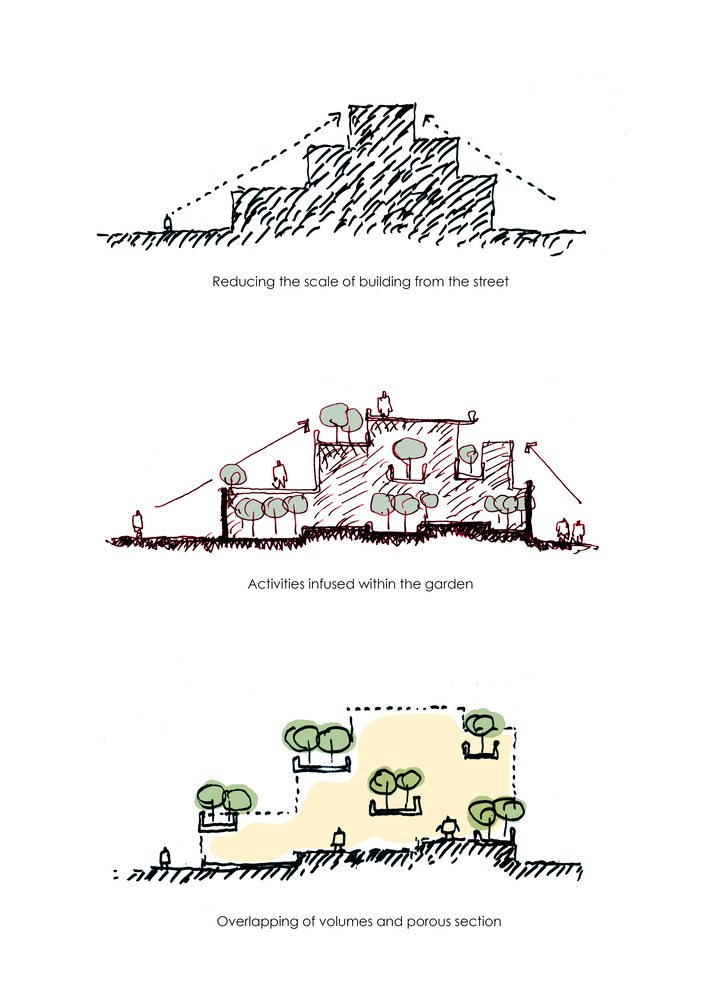 The integration of multiple green spaces, including a kitchen garden and a double-height green court, reflects a deep respect for nature and local gardening traditions. These elements foster a connection to the earth and community, aligning with the architects’ vision of creating spaces that are as socially vibrant as they are serene.
