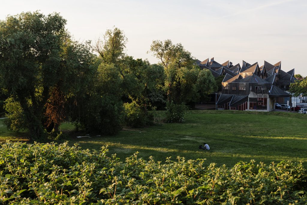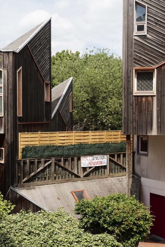 The Cité Pierre Sémard is a striking ensemble due to its elaborate and unpredictable volume. It is also known as the Pièce Pointue, or "pointed piece," and is characterized by its numerous bevelled roofs and larch-clad facades cut along different axes. When the sun reflects on them, the colour range varies from white to brown to ochre. In respect to the suburban houses surrounding the site, the buildings are low and have ground floors that open up to generous public courtyards or private gardens. The dwellings are interlocked and support each other, linked by open corridors that serve, shape, and wind around them. These outdoor walkways serve a purpose beyond simply connecting points on the plan; they become places for gathering and observation, offering visual openings that provide different perspectives of the surrounding landscape.