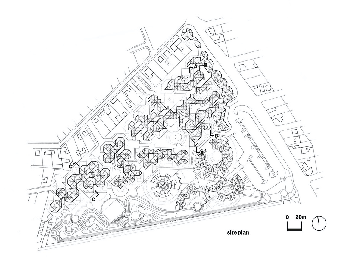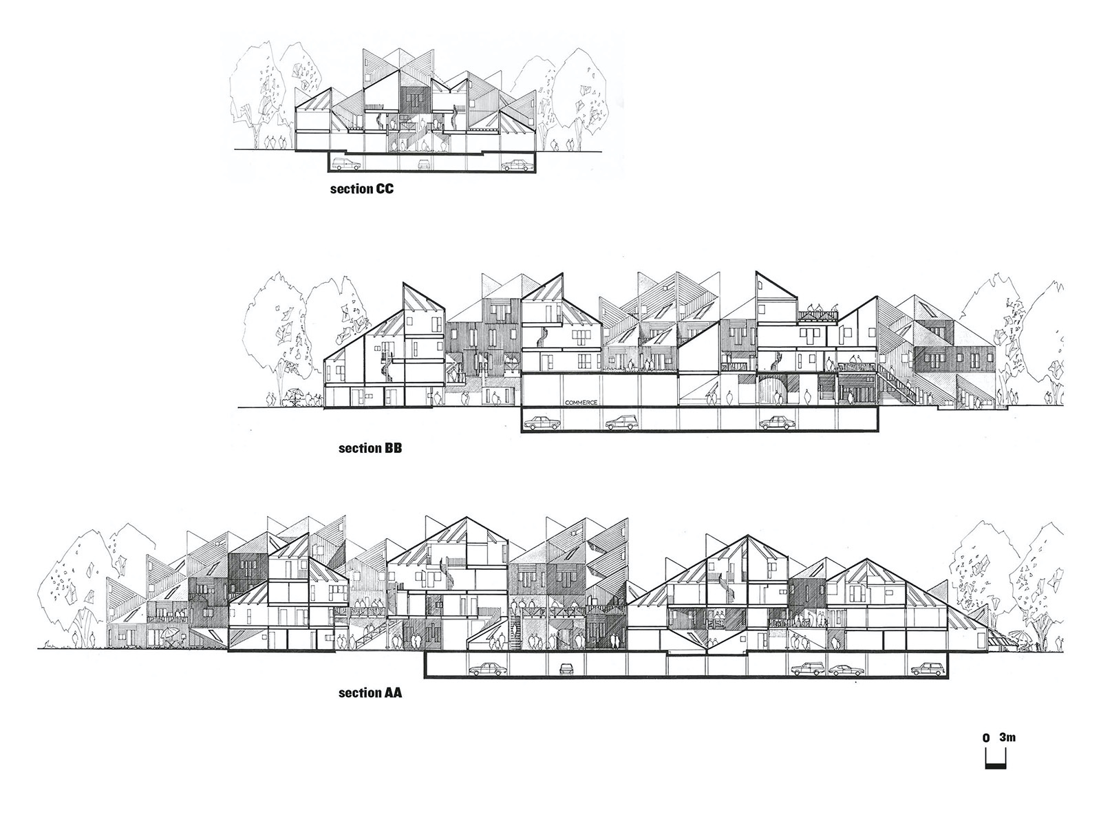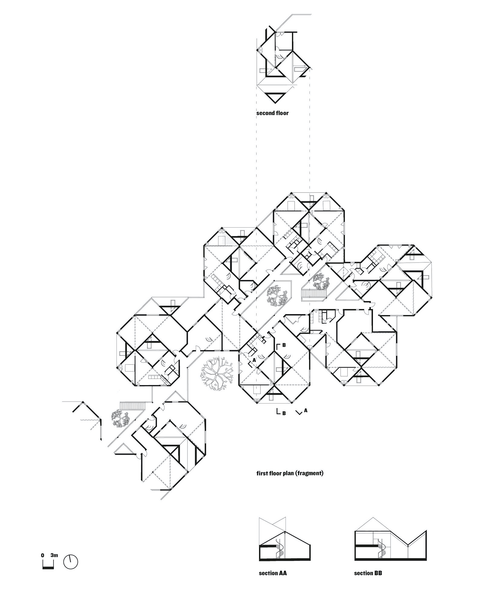 As you walk through the estate, you'll notice that the buildings become taller and more densely packed together. The shortest ones are only one story high, while the tallest ones are four stories tall. The entire area is designed with pedestrians in mind, and cars are directed to an underground parking garage that is located under the ground floor slab, which is the only major element made of concrete. There is a sense of discovery and complexity in the space that is not present in traditional, orthogonal conceptions of space. According to Buczkowska, "life is as complex as the escape of the gaze" and it is necessary to allow for this complexity to be seen by breaking away from rigid, linear forms that are often found in cities today. She believes that the viewer's point of view should be constantly stimulated and that the architect should focus on creating a sense of discovery. Her approach goes beyond the typical tower and slab blocks that were often used for social housing at the time.
