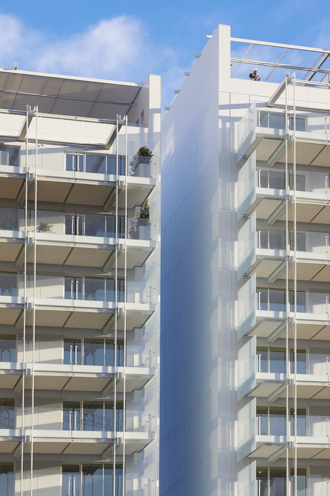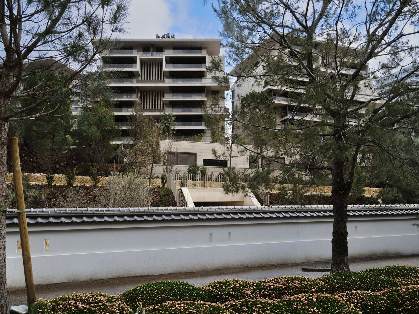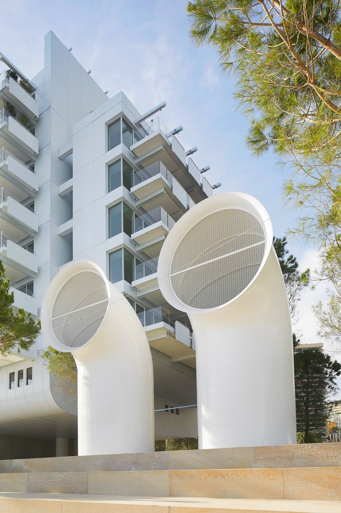 At the heart of the development, a man-made hill planted with large stone pines helps integrate the extension into the existing landscape, creating a visually appealing transition from sea to land.