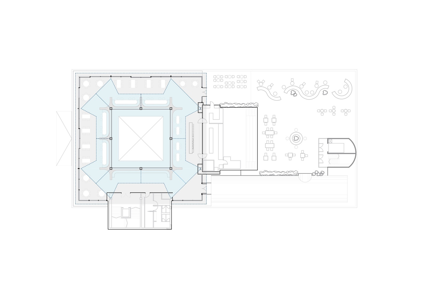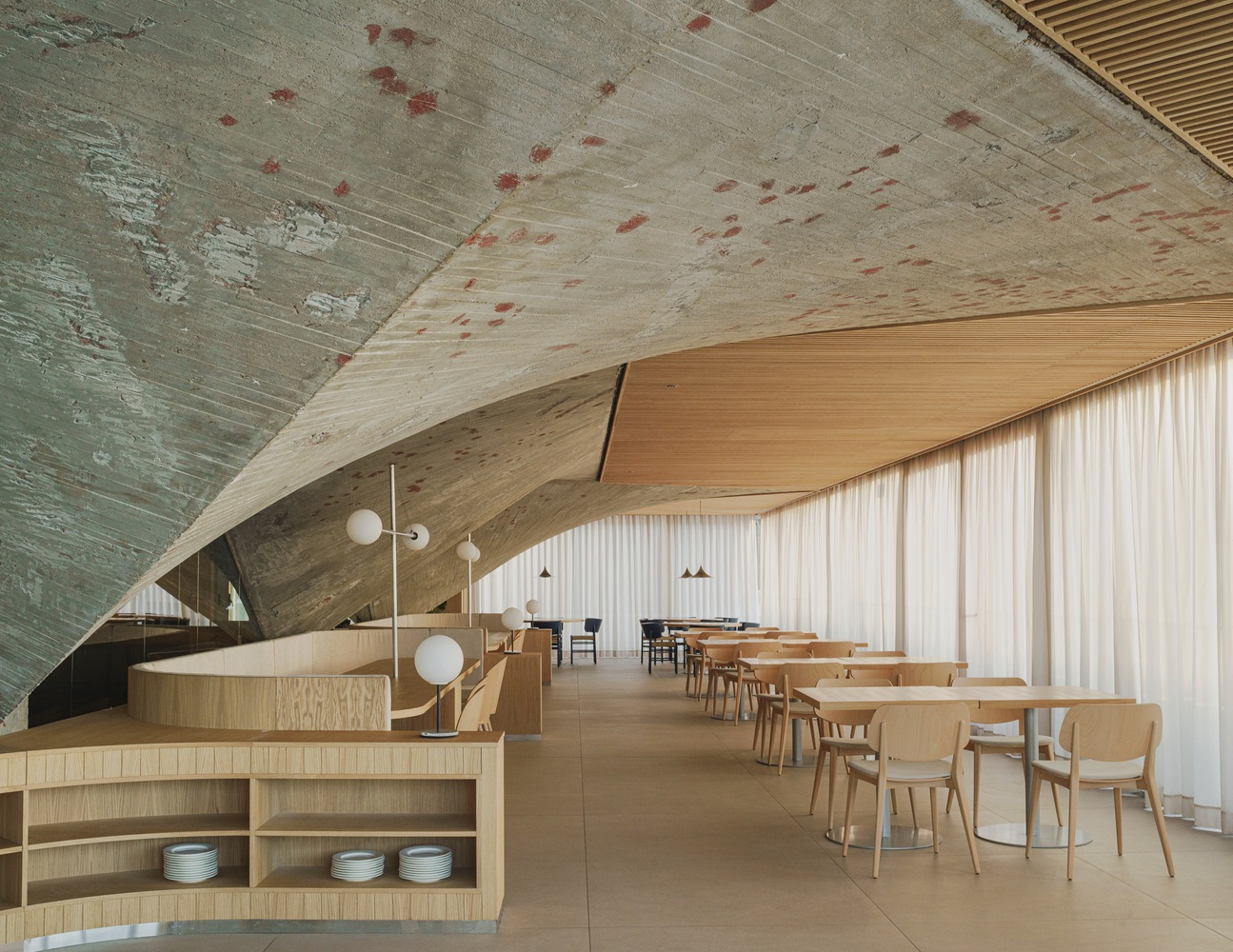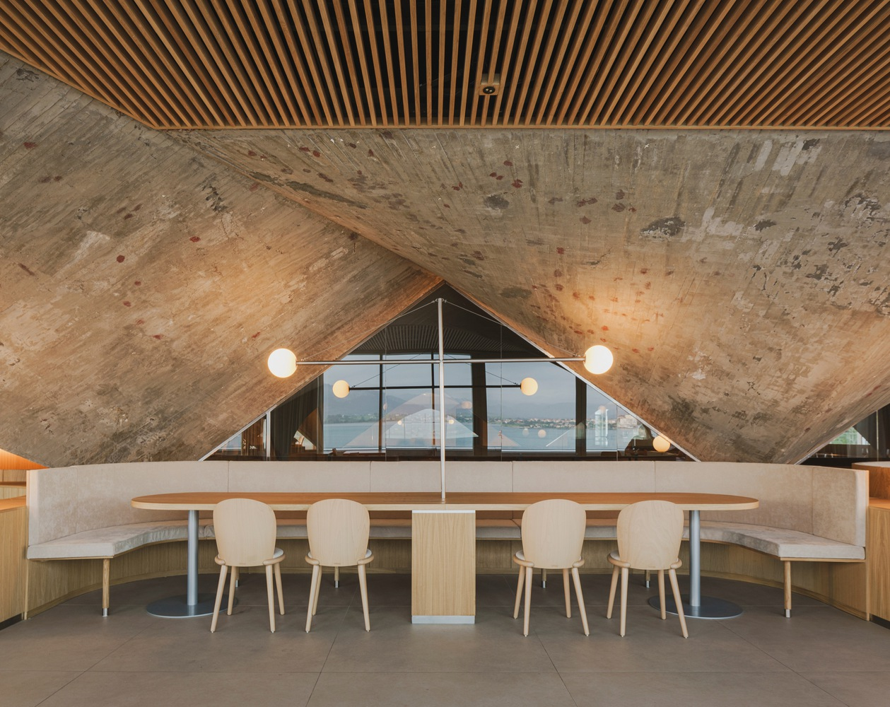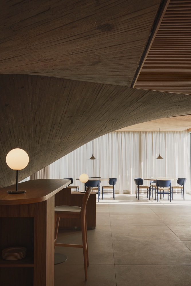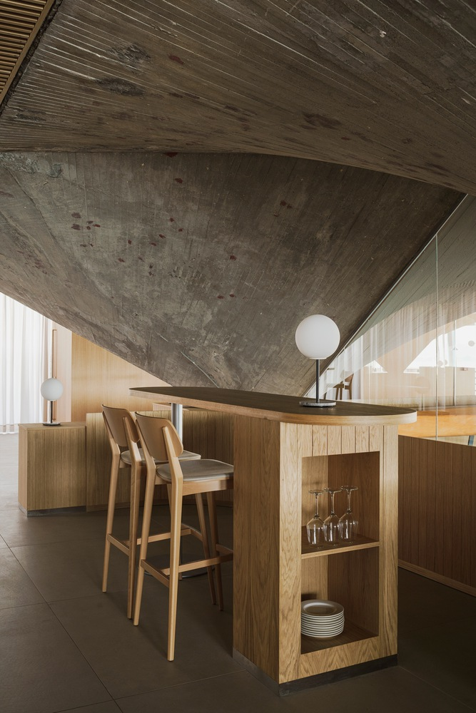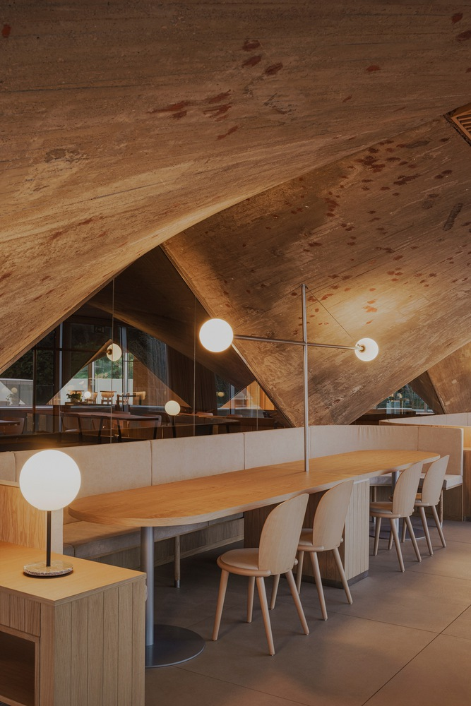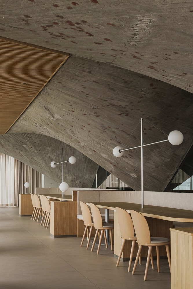 The restaurant's design addresses the building's historical pathologies by adding a new volume that complements the existing paraboloids. This addition not only resolves structural issues but also transforms the space into a focal point for visitors, with triangular wooden false ceilings framing the concrete structures and highlighting their raw beauty.