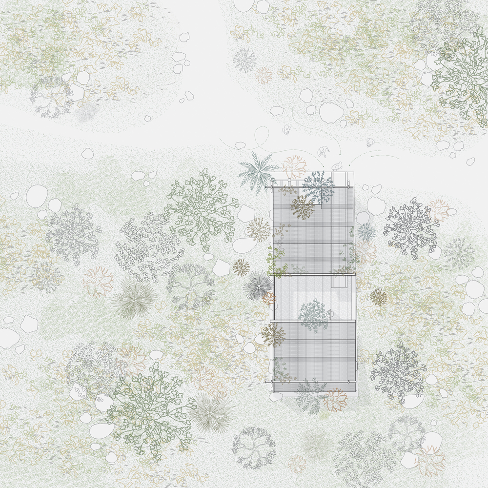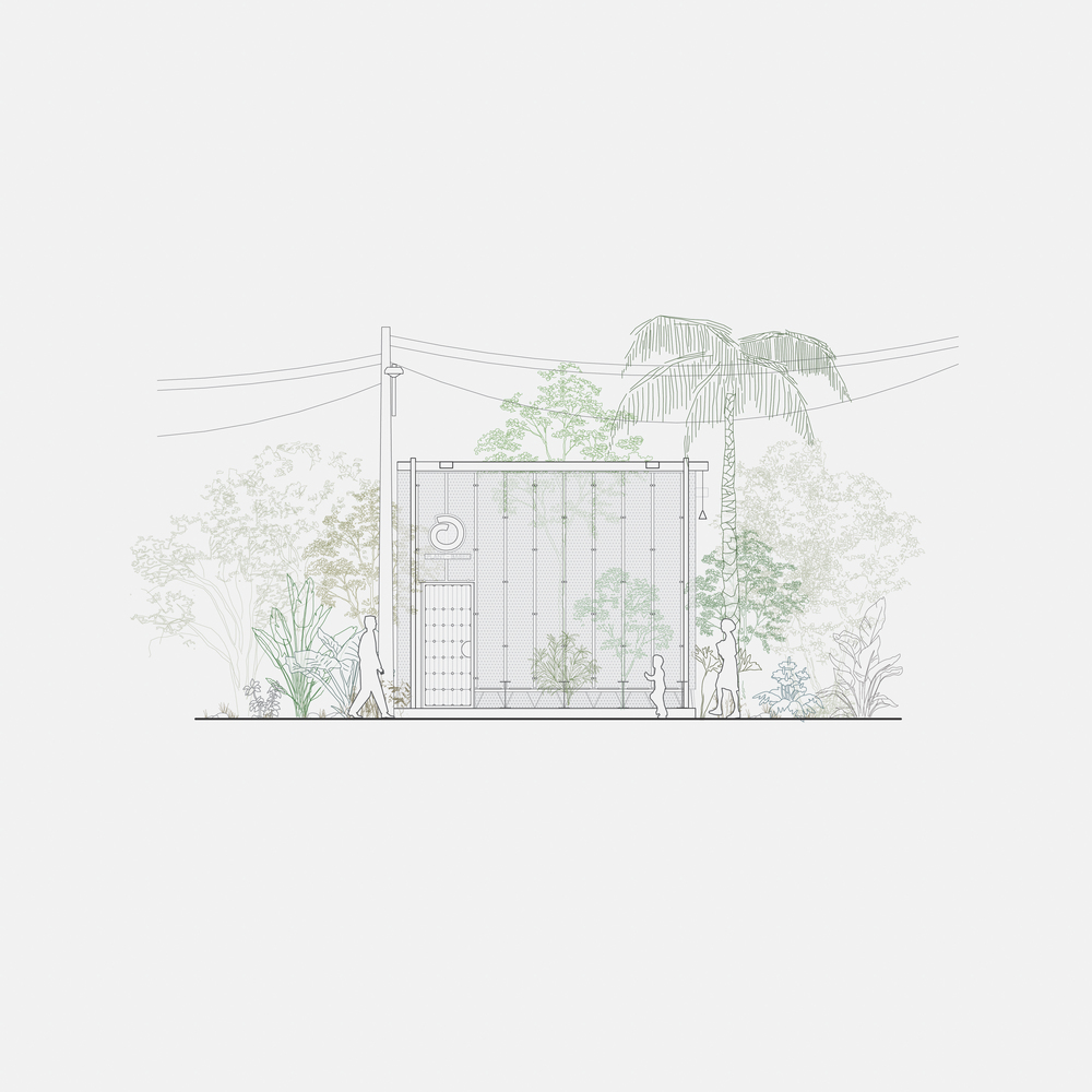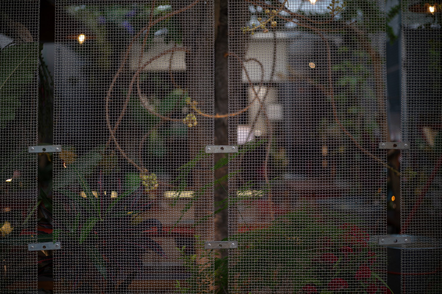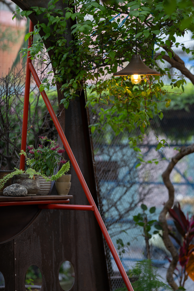 The partitions are constructed from 3mm weathered steel sheets, bent along the edges for both structural reinforcement and aesthetic softness. These handmade elements evoke the texture and tone of aged timber, grounding the space in tactile familiarity while remaining contemporary. The façade, composed of steel mesh, lightens the visual weight of the building and allows for unobstructed interactions between interior and garden.