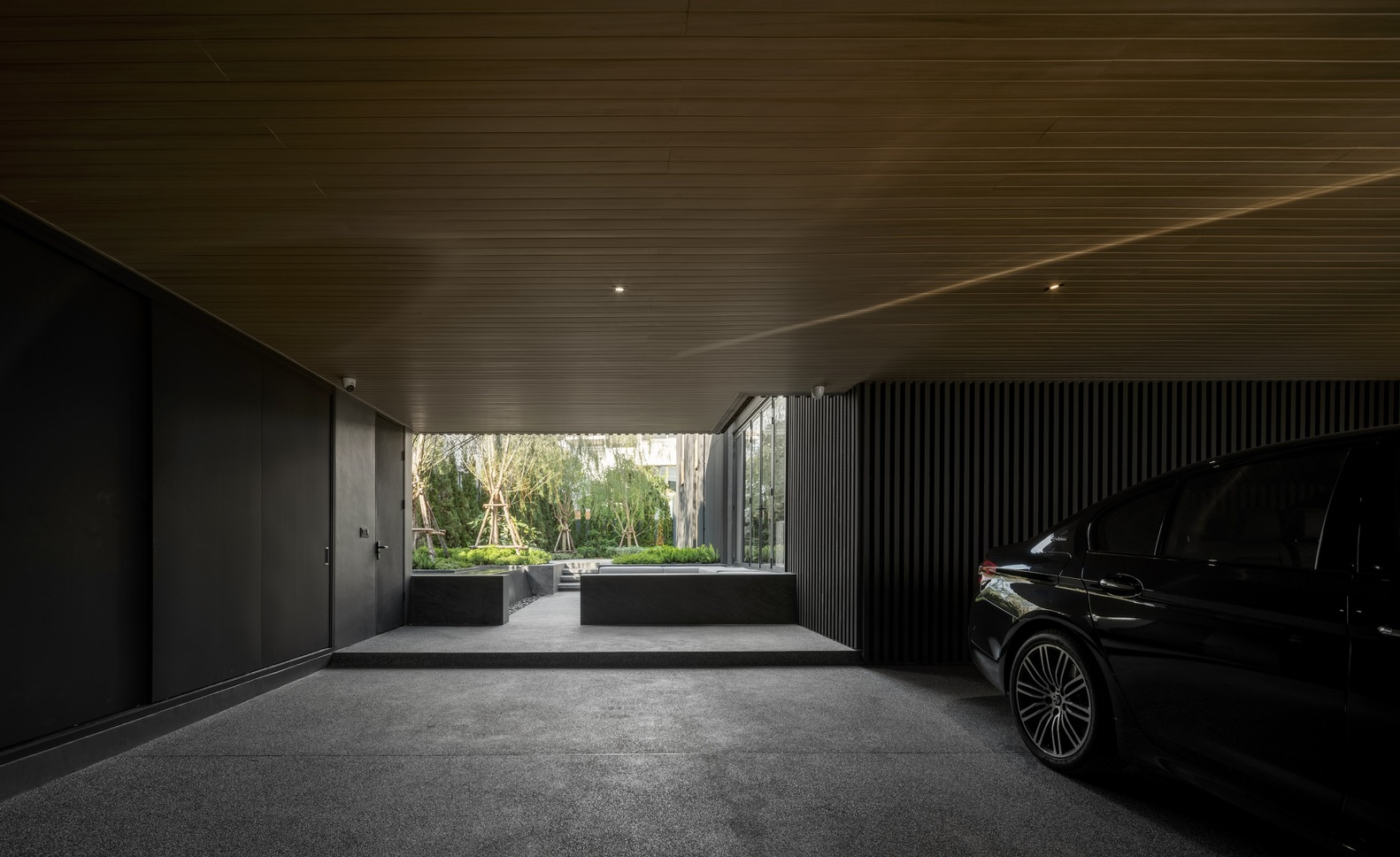 The landscape design of Warmblack House does not adhere strictly to Western or Eastern styles but instead creates a hybrid that enhances the approach to the main living areas. The use of bushes and willows adds depth and a sense of continuity from the indoor spaces to the outdoors, reinforcing the home’s connection to its natural surroundings.