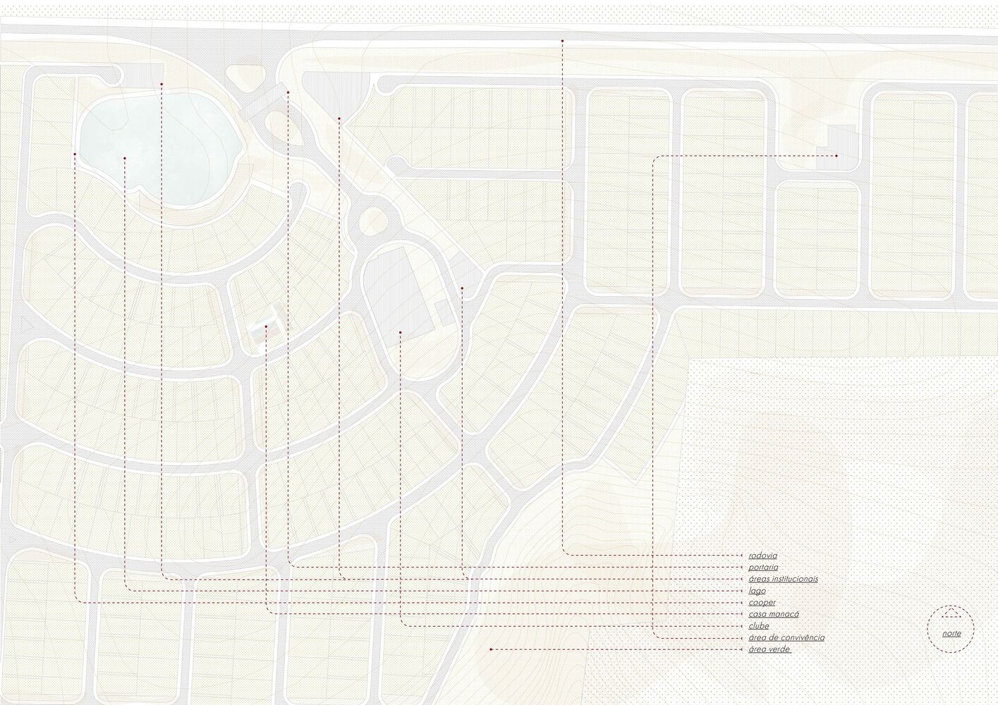 The architectural plan is centered around three main cores that define the spatial distribution of the house. These include a service area that aligns with the street for accessibility, a social hub that opens to panoramic views of the lake and garden, and a private zone that ensures seclusion for the bedrooms, oriented towards a serene private garden.